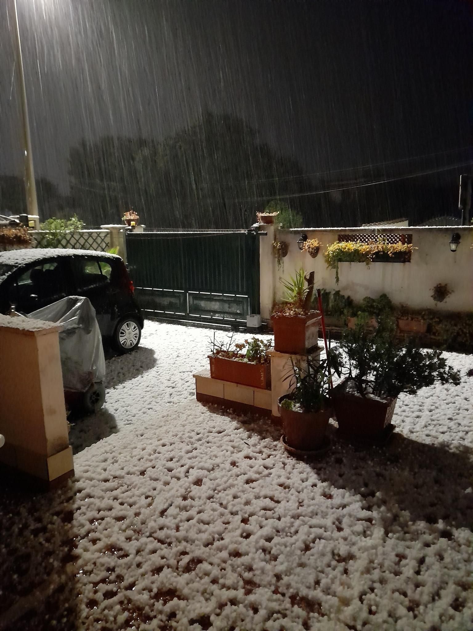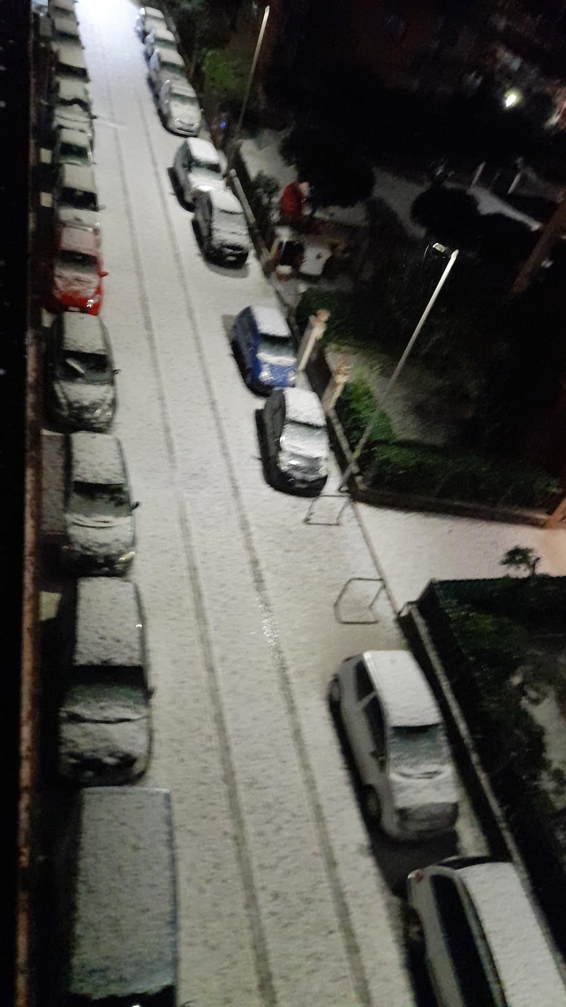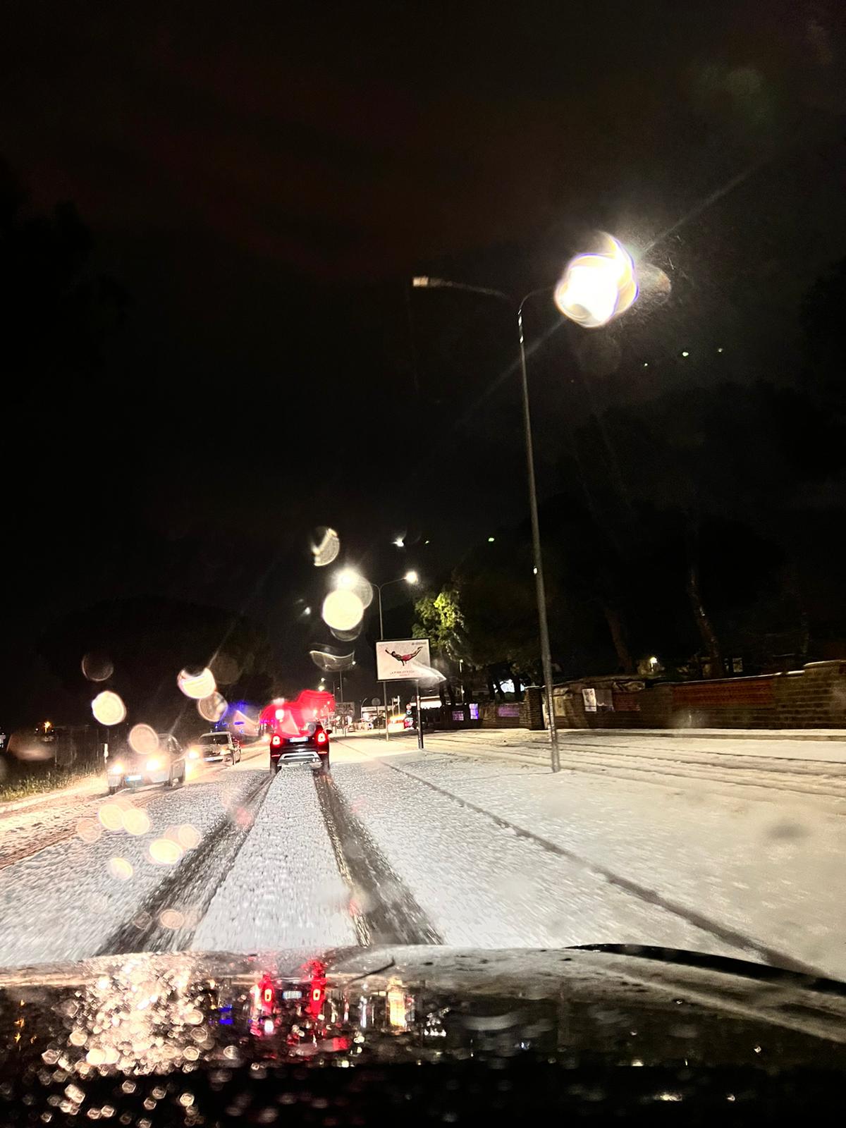 Auto e tetti imbiancati, dunque. La grandine era di dimensioni notevoli, come dimostrano le foto. Già oggi nel pomeriggio la neve aveva fatto la sua prima comparsa a Pomezia. Non molta, ma abbastanza da imbiancare le strade.