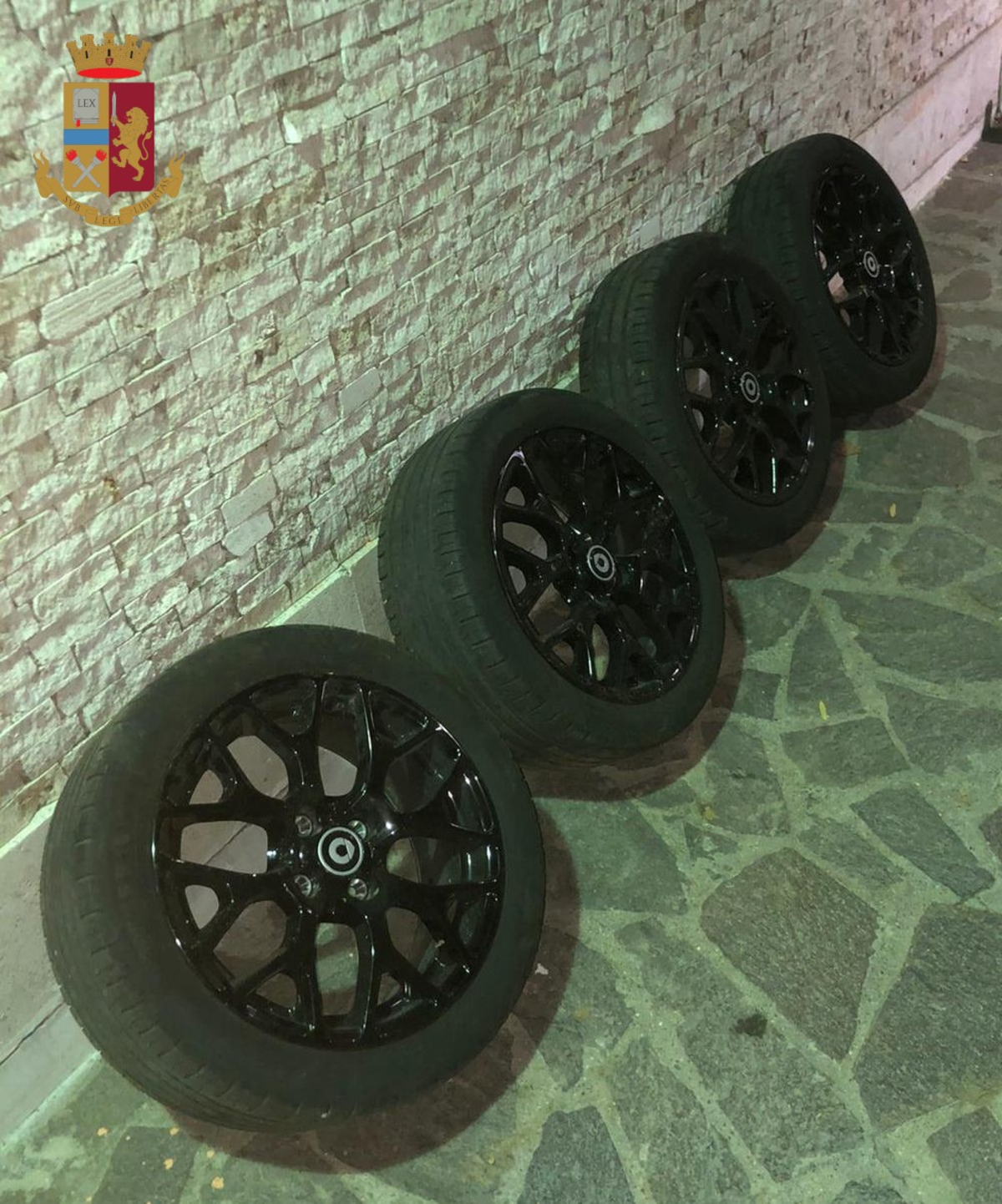 La coppia di ladri è finita in manette perché indiziata di furto aggravato in concorso, mentre a seguito di perquisizione veicolare gli agenti hanno trovato gli pneumatici smontati poco prima e sono stati restituiti al legittimo proprietario.