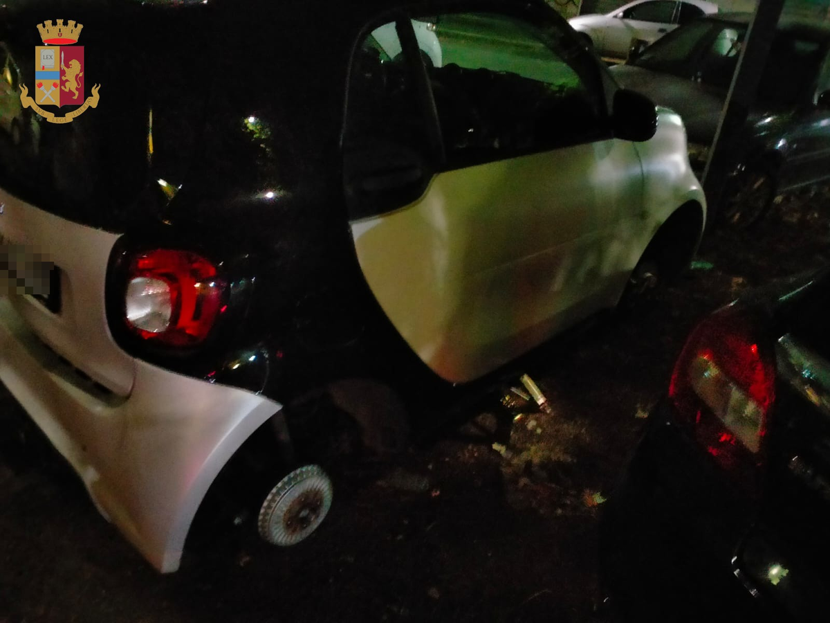Nel corso del servizio i poliziotti hanno visto arrivare un’auto con a bordo due uomini. I due sono scesi e hanno iniziato a svitare i bulloni dei quattro pneumatici. Una volta fatto hanno caricato le ruote nel portabagagli della loro auto e sono ripartiti.