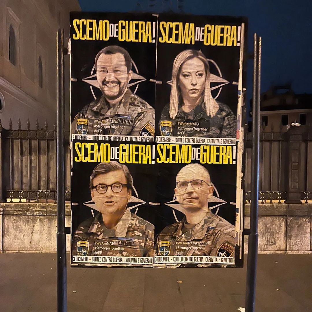 Tra i temi trattati nel corteo, ci sarà anche la contrarietà al carovita e la conduzione del Governo da parte di Giorgia Meloni. Questo sabato, ovvero il 3 dicembre, la manifestazione partirà da piazza della Repubblica. Militant, in merito ai manifesti, rivendica: “Il governo Meloni si appresta a mettere il pilota automatico della guerra almeno fino alla fine del 2023 in perfetta continuità con il governo Draghi e tutte le forze politiche che lo hanno sostenuto, anche quelle che oggi sono all’opposizione e cercano di ricostruirsi una verginità ‘pacifista”.