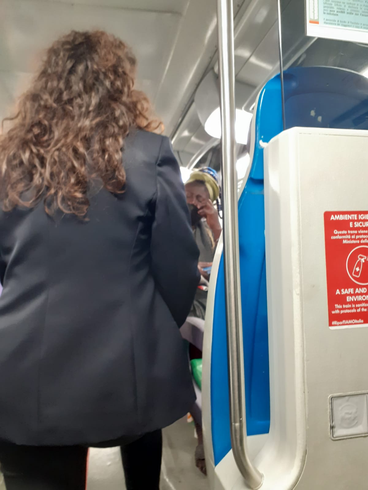 Dalle invettive dure e feroci lanciate in 3 lingue diverse contro il capotreno l’africana è già passata a toni più pacati. Un’altra donna da dietro le allunga una mascherina, quella che poco prima si era rifiutata di indossare. Fa resistenza, sulle prime la allontana da sé. Infine la accetta.