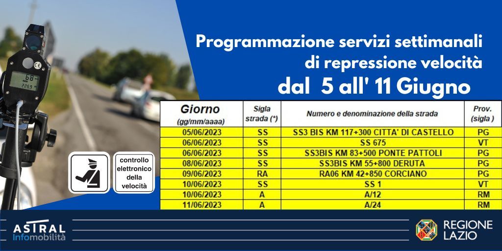 Autovelox Lazio, calendario postazioni mobili da lunedì 5 giugno 2023 a domenica 11 giugno 2023