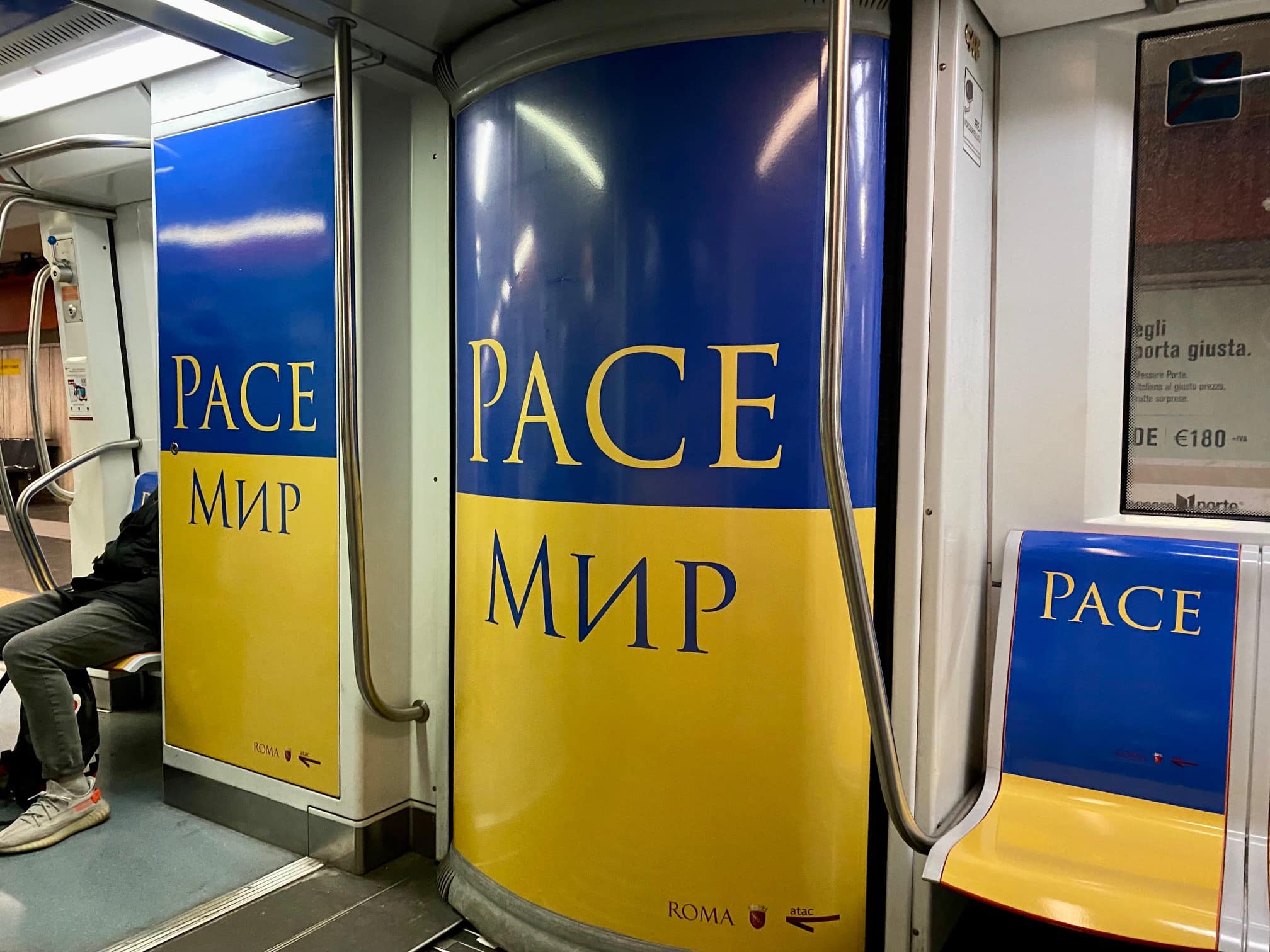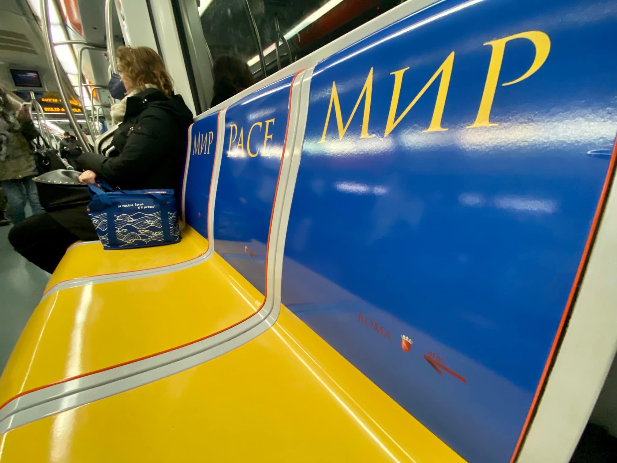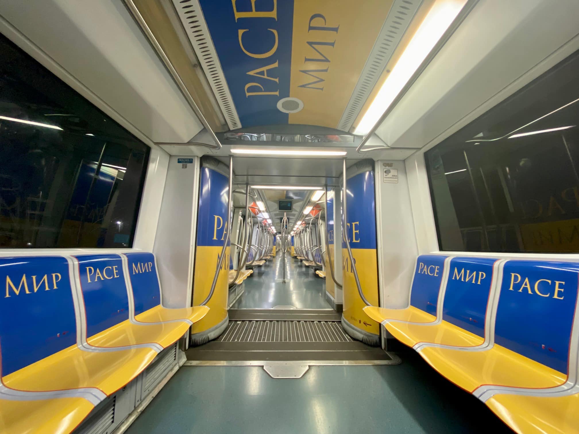 Tra i sedili dei passeggeri, e le pareti dei vagoni, si legge a chiare lettere la parola “Pace”, riportata nelle due lingue: italiano e ucraino. “Sulla linea A della metropolitana di Roma Capitale viaggia un treno vestito con i colori della bandiera Ucraina per esprimere la nostra solidarietà nei confronti di tutto il popolo ucraino e dire basta alla guerra”. Così spiega Atac in un messaggio su Facebook