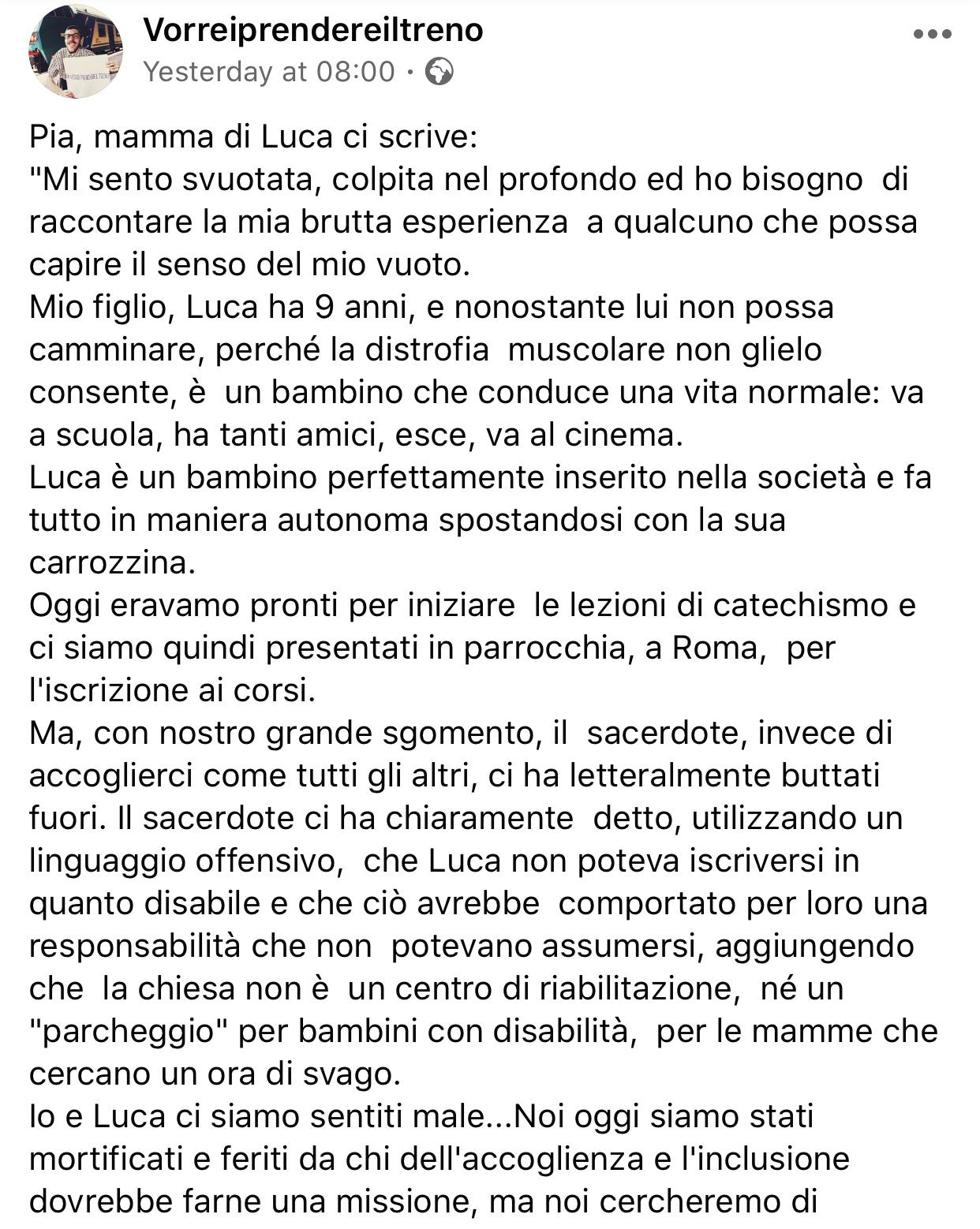 Pia è la mamma di Luca, un bambino di 9 anni che non può camminare perché affetto da distrofia muscolare. Un bimbo che nonostante la sua patologia riesce a condurre una vita normale: va a scuola, ha tanti amici, esce, va al cinema – scrive la donna. Un bambino che, però, si è sentito escluso da chi invece dovrebbe rappresentare l’accoglienza e l’inclusione: un parroco.