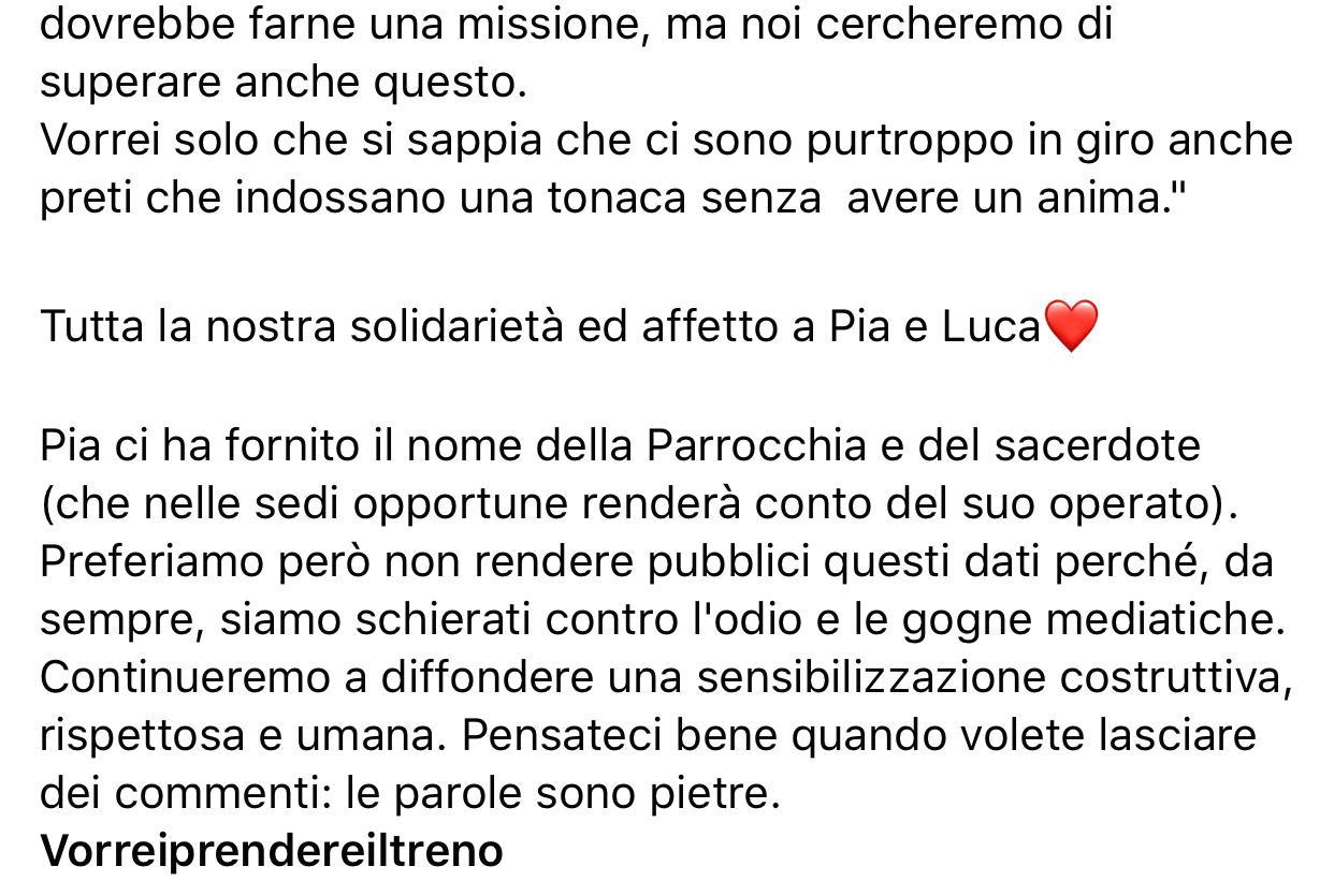 Una storia che stando a quanto raccontato indigna e lascia stupefatti. Mortifica e ferisce ancor più perché un’azione compiuta da “chi dell’accoglienza e inclusione dovrebbe farne una missione”. “Vorrei solo che si sappia che ci sono purtroppo in giro anche preti che indossano una tonaca senza avere un’anima” – conclude Pia.
