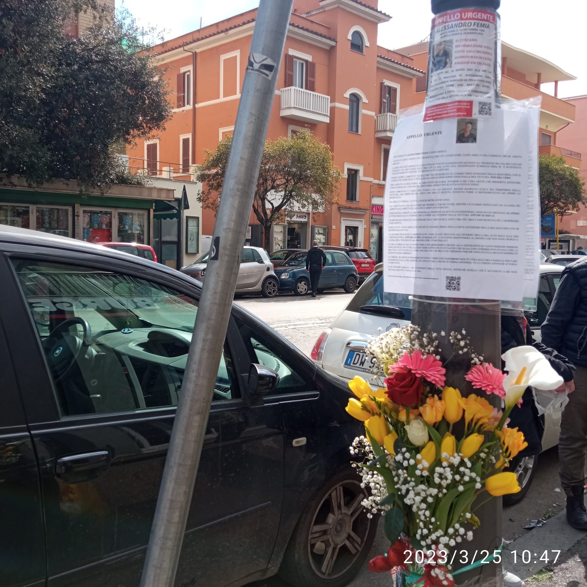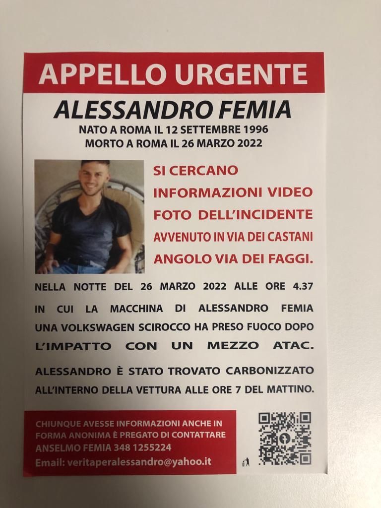 “Mi chiamavo Alessandro Femia e sono morto. Avevo 25 anni, ero un lavoratore, avevo una fidanzata, tanti amici e una famiglia che mi amava. La mattina di sabato 26 marzo 2022 a Roma all’incrocio tra Via dei Castani angolo Via dei Faggi, alle ore 4.37 la mia auto una VOLKSWAGEN SCIROCCO nera ha avuto un impatto con un mezzo Atac a metano. Subito dopo lo scontro ‘qualcuno’ ha dichiarato di avermi visto scendere dalla macchina con il cappuccio nero sulla testa ed allontanarmi zoppicando dalla mia vettura. Non era vero”. Sì, perché un testimone all’epoca dei fatti ha raccontato di aver visto qualcuno allontanarsi dal punto in cui era avvenuto lo scontro. Un’omissione di soccorso che avrebbe potuto salvare la vita del giovane Alessandro. Lui non era fuori, era rimasto intrappolato in quella vettura. Che poi ha preso fuoco.
