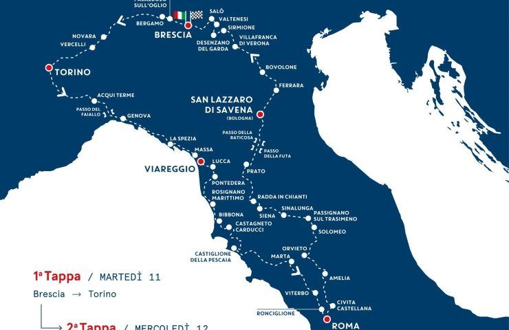 L’indomani si ripartirà in direzione sud – prima però, novità di quest’anno, un passaggio a Genova – con rotta verso Roma. Quindi giro di boa e ripartenza con tappa, tra le altre, a Lucca, Castiglion della Pescaia, la caratteristica Marta, e ancora Orvieto ma anche Ferrara e una passerella lungo il Lago di Garda. Traguardo finale, come detto, nuovamente Brescia sabato 15 giugno.