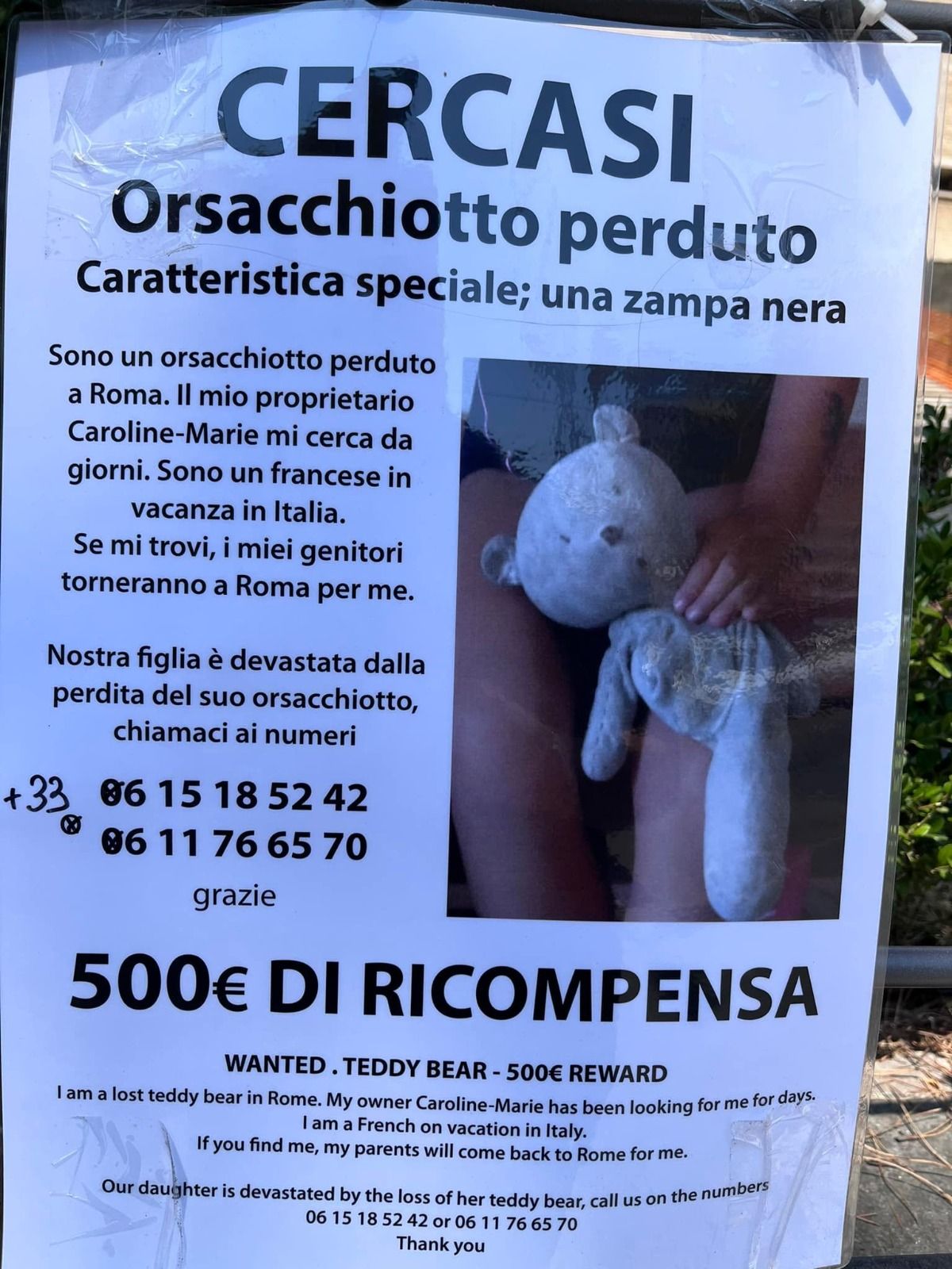 Una maxi ricompensa a chi ritroverà…un orsacchiotto smarrito. E’ questo il manifesto apparso in alcune zone di Roma che sta facendo discutere (e non poco) il popolo della rete. Nel testo si legge: “Sono un orsacchiotto perduto a Roma. Il mio proprietario Caroline-Marie mi cerca da giorni. Sono un francese in vacanza in Italia. Se mi trovi i miei genitori torneranno a Roma per me”.