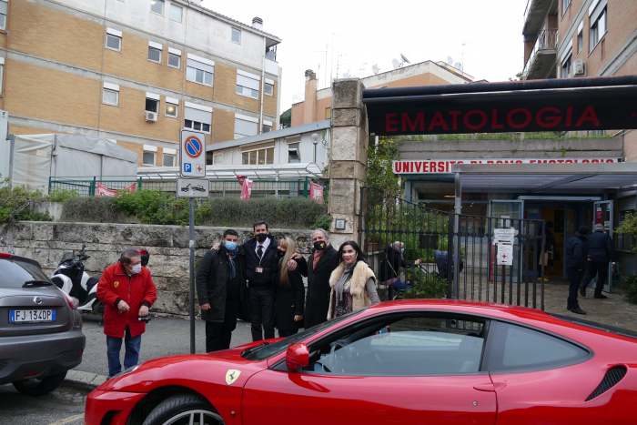 Nella stessa mattinata a sorpresa, per proseguire il cammino iniziato lo scorso Natale con l’evento “Note per la Leucemia” al Conservatorio di Santa Cecilia, organizzato dalla giornalista Paola Zanoni e il regista Alessandro Di Filippo, sono stati consegnati giocattoli al reparto di Ematologia pediatrica in Via Benevento, anche qui per rispetto della normativa anti Covid senza entrare nell’Ospedale, con la collaborazione del coordinatore infermieristico Marco Fabbri e Guendalina Sacconi, con l’attore Franco Di Maio con una sola Ferrari al seguito per la Scuderia Ferrari Club Roma Appia Antica, Bianca Vertolli, Francesco Rosci, Giovanni Roberti e la prima Miss sorda per Miss Italia 85 Elisabetta Viaggi.