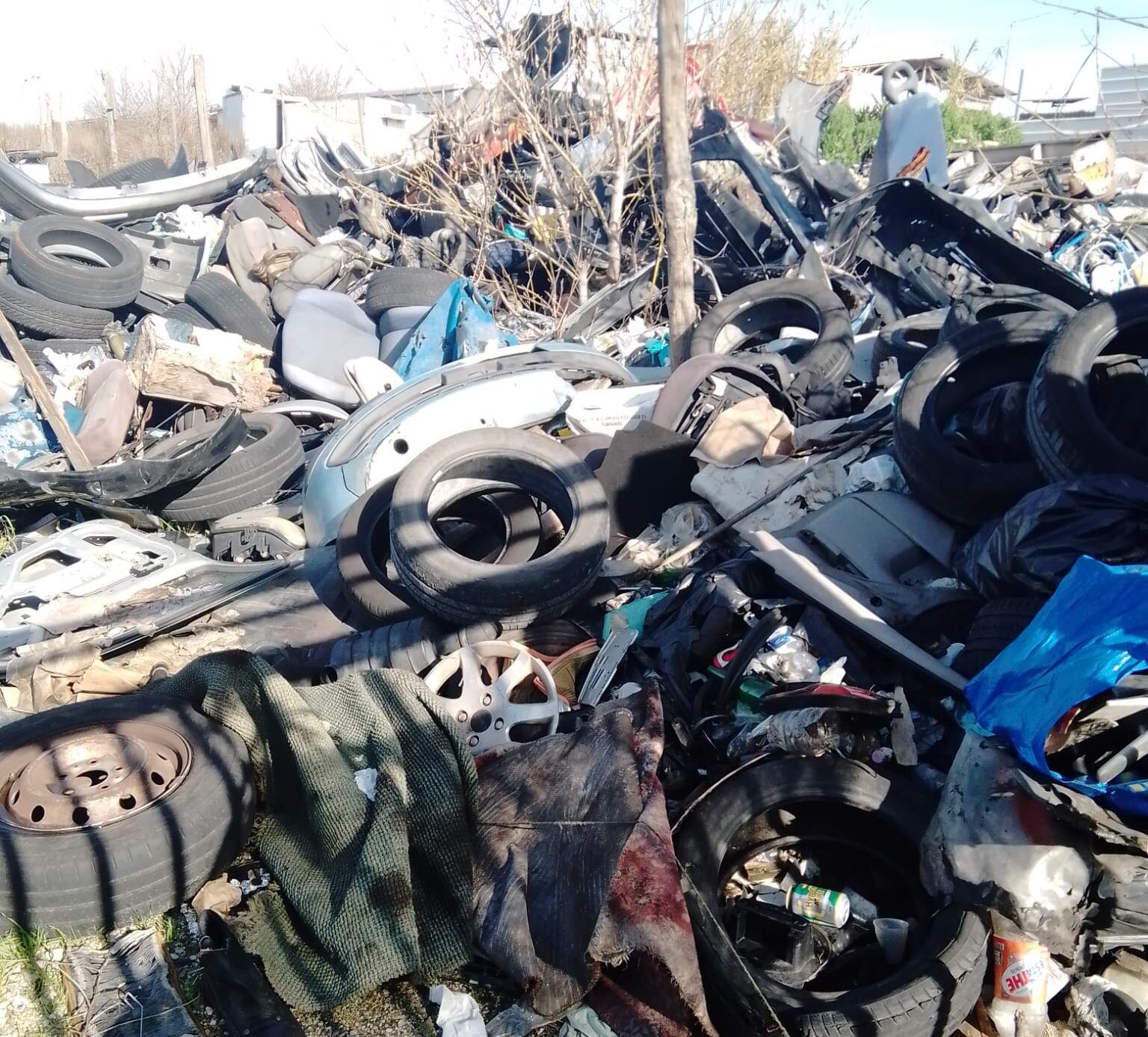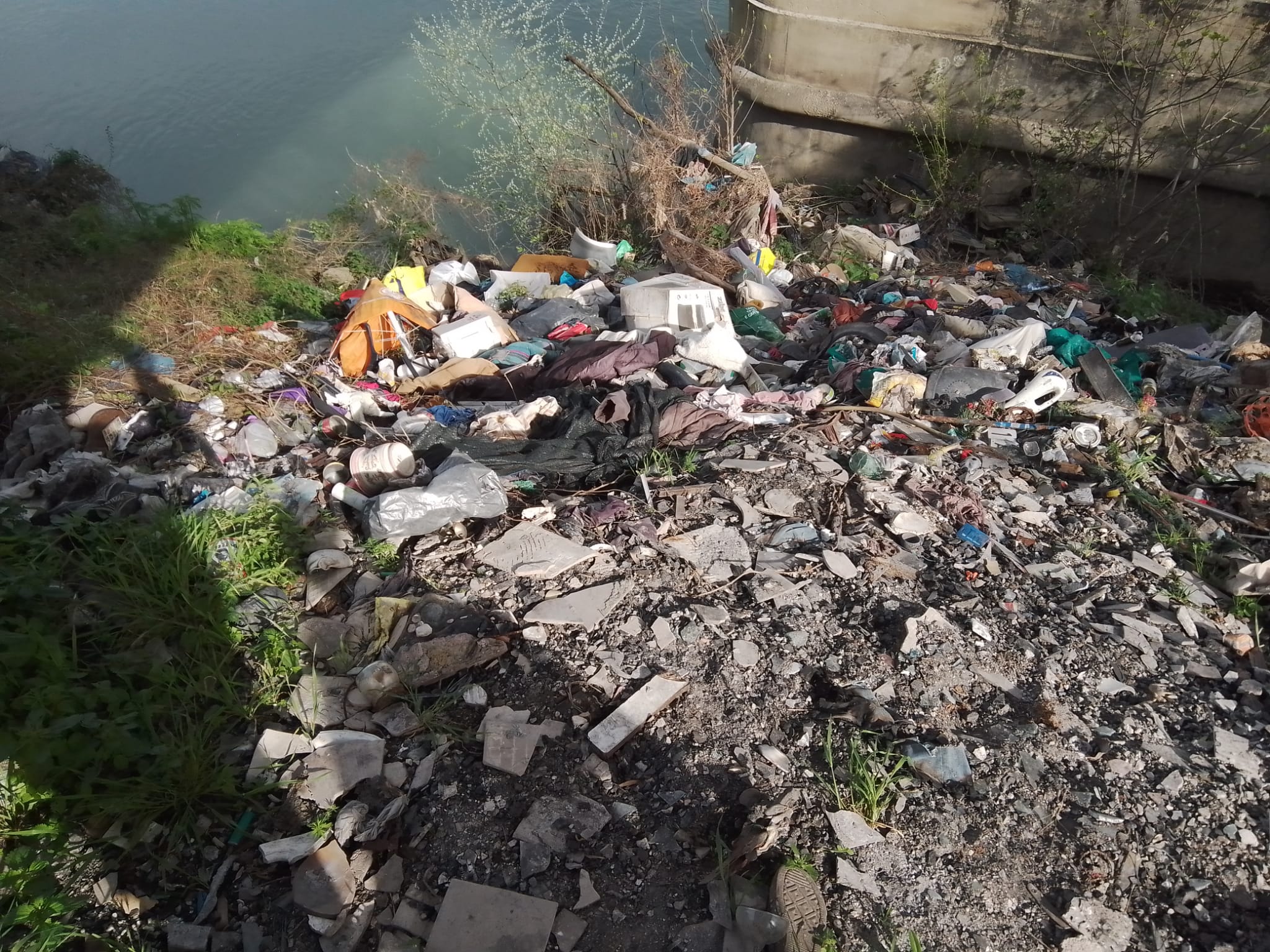A poca distanza dal telone pieno di rifiuti tossici, un’altra enorme discarica. Qui ci sono calcinacci, resti di baracche, sia in legno che in metallo, con addirittura pezzi di arredo e di oggettistica. Alcuni sono ancora rimasti intatti, come delle scodelle in plastica. E rifiuti di ogni tipo. Anche qui si parla di una mega discarica. Con l’aggiunta che, trattandosi di rifiuti posizionati a ridosso del fiume, potrebbero cadere in acqua ed essere trascinati fino al mare.