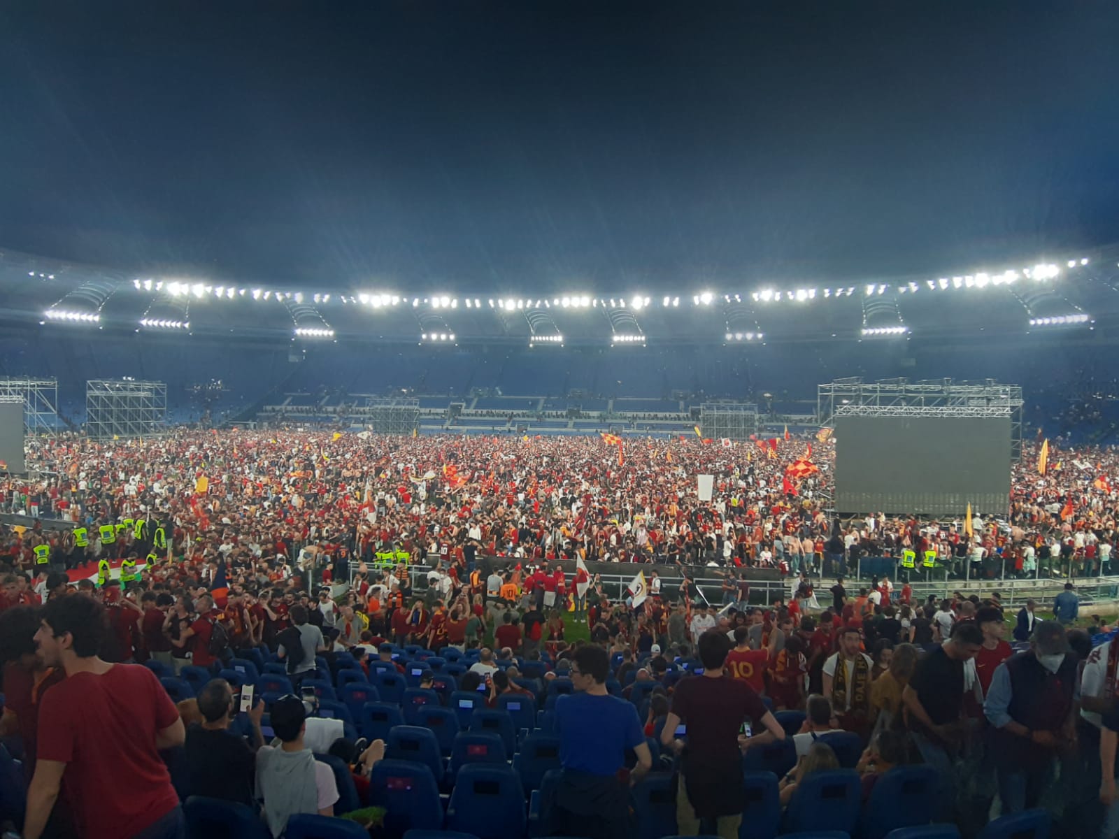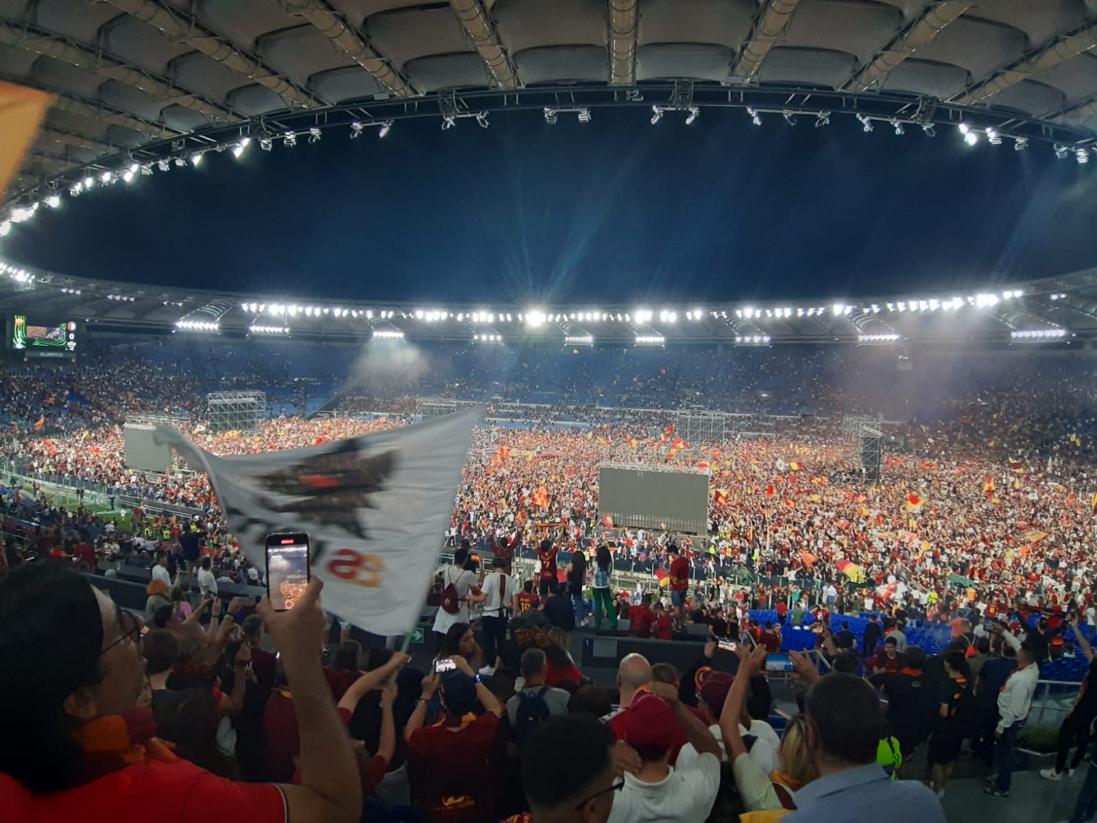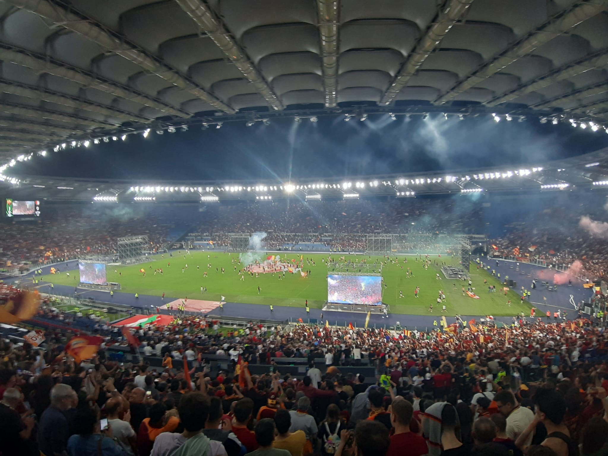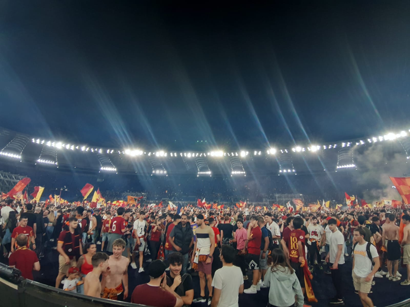 Roma campione dopo la vittoria contro il il Feyenoord. I giallorossi vincono la Conference League ed è festa grande nella città eterna. Cori, caroselli, baci e abbracci. Il popolo giallorosso ieri sera è impazzito di gioia. Il gol di Zaniolo ha fatto esultare gli oltre 50 mila tifosi accorsi in uno stadio Olimpico stracolmo e surreale. I maxischermi accorciavano la distanza con Tirana e il boato di gioia risuonava in tutta la città.