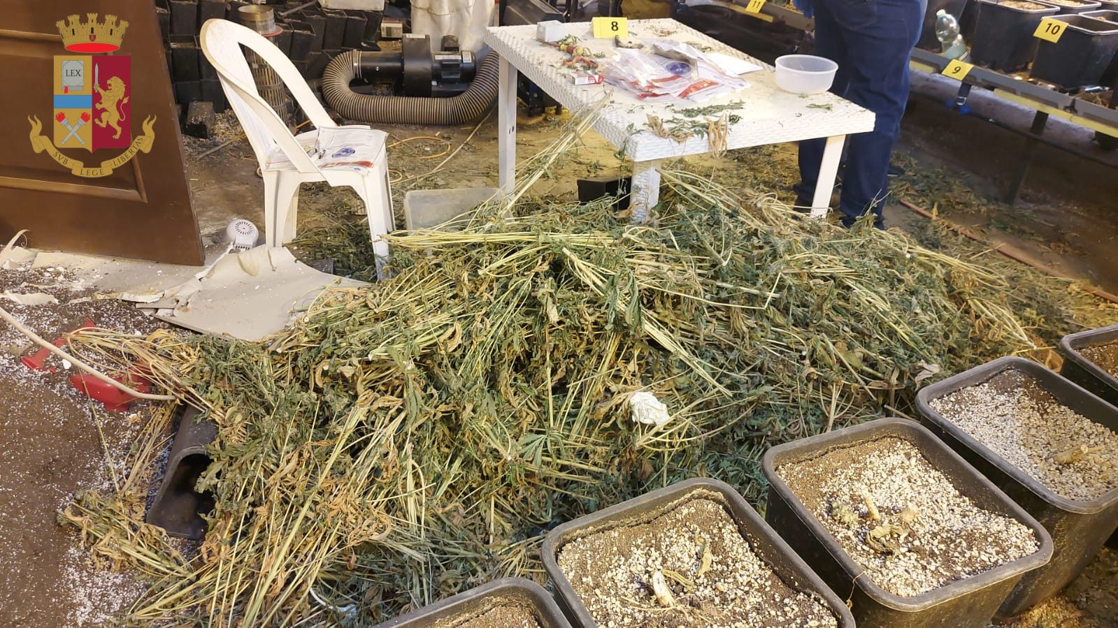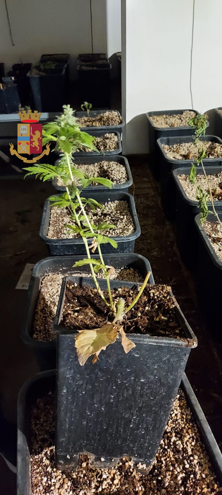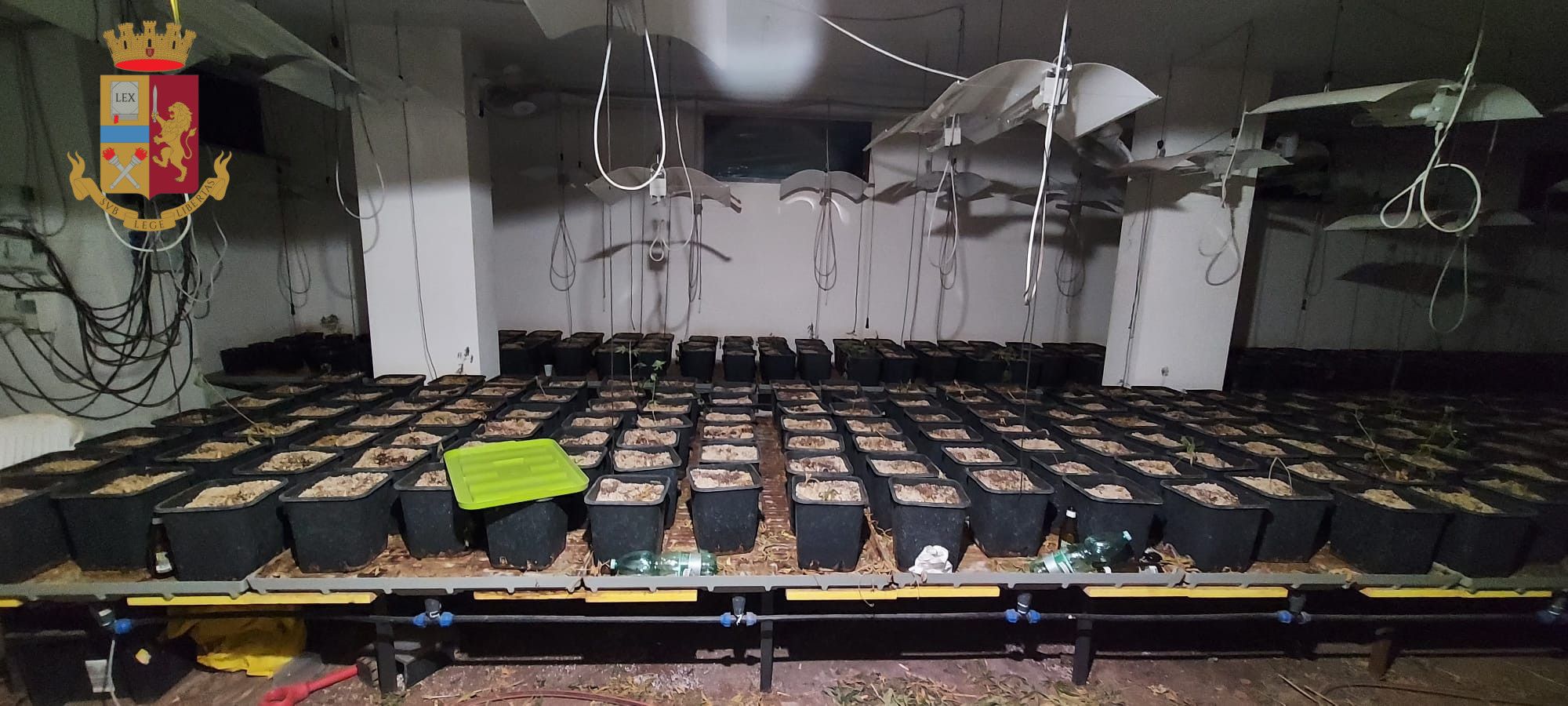 Cumuli di piante di marijuana poggiate in terra già esfoliate, 45 gr di marijuana rinvenuti all’interno di un essiccatore e altri 30 gr in un barattolo in vetro, 3 taniche piene di fertilizzante, accelerante per la crescita delle piante, 1 macchinario per l’esfoliazione e il confezionamento della sostanza stupefacente, 1 diario riportante con accuratezza le date con i cicli vitali delle piante, con specifiche giornaliere sull’avvenuta irrigazione e concimazione delle stesse, sistemi di areazione forzata ed essiccazione delle piante, 43 lampade alogene, 1 piantina di marijuana in infiorescenza di circa 30 cm, 548 vasi contenenti rimasugli di fusti di piante di marijuana tagliati alla base. Questo quanto rinvenuto dagli agenti del commissariato Romanina, diretto da Moreno Fernandez nel corso di una perquisizione su una porzione di una villa bifamiliare sulla via Ardeatina, scoperta dai poliziotti proprio accanto ad una associazione dedita al recupero di tossicodipendenti.