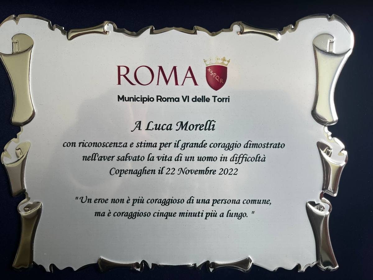 Il giovane studente universitario è stato capace non solo di salvare una vita, ma di far conoscere in un Paese straniero il suo garbo e il suo altruismo. Una vicenda per la quale non poteva non ricevere un riconoscimento e così oggi, 24 dicembre 2022, alle 12, Luca è stato omaggiato di una targa, simbolo del suo coraggio e del suo altruismo.
