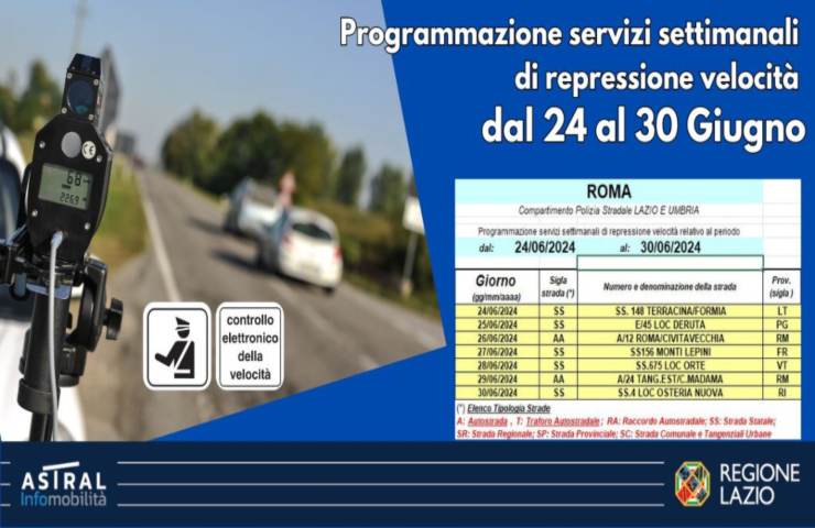 Autovelox Lazio: i controlli da lunedì 24 giugno a domenica 30 giugno 2024