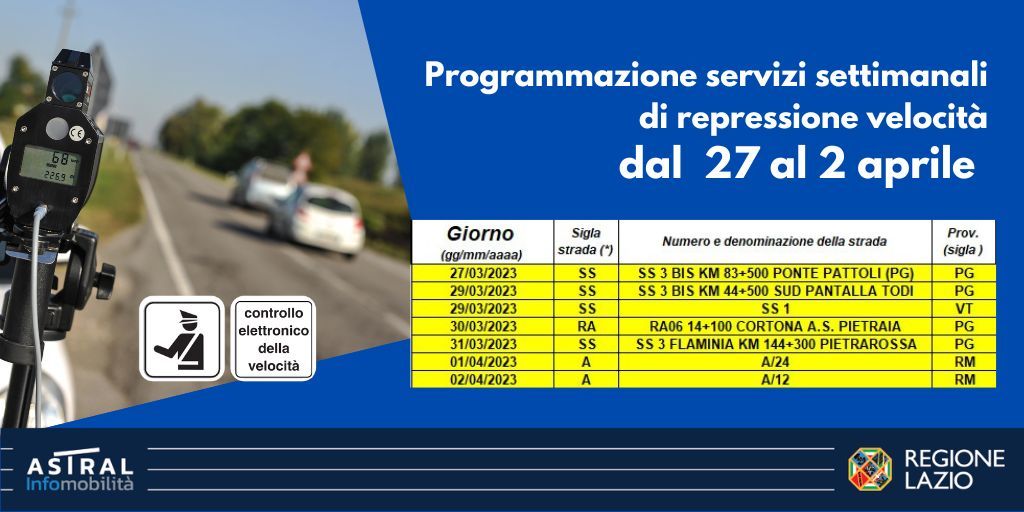 Da oggi pertanto, lunedì 27 marzo 2023, e fino a domenica nuove postazioni di controllo della Polstrada interesseranno alcune delle strade a maggior percorrenza della Regione Lazio. Stavolta però, a differenza delle ultime settimane, non ci saranno postazioni autovelox (mobili) sulla statale Pontina sebbene quest’ultima sia stata teatro negli ultimi giorni di alcuni gravi incidenti, di cui uno purtroppo anche dall’esito mortale. Ad ogni modo ecco le postazioni mobili del telelaser di questa settimana: