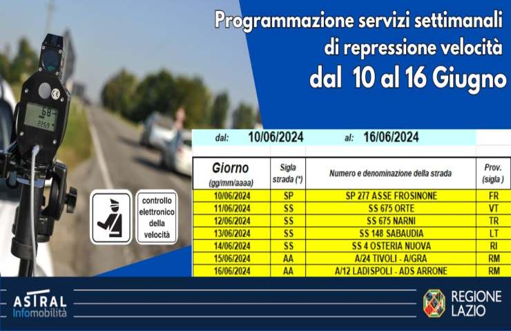 Autovelox Lazio, le postazioni mobili fino a domenica 16 giugno