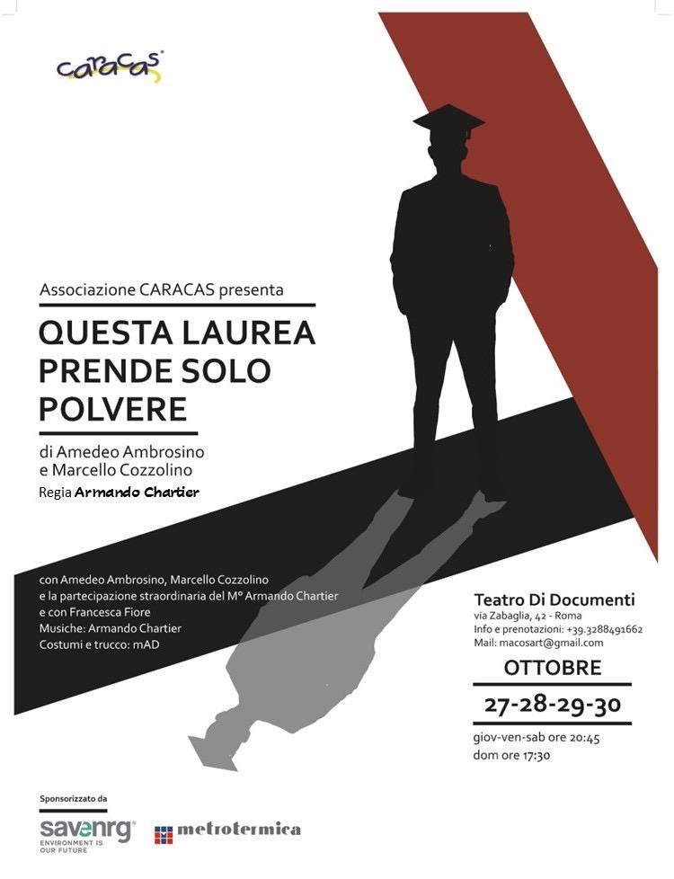 Dal 28 al 30 ottobre 2022 sbarca a Roma la pièce in due atti della compagnia Caracas di Napoli, diretta e musicata da Chartier. Nel piccolo “teatro gioiello” di via Zabaglia a Testaccio la storia tra sogno e realtà del laureato-precario Amedeo, che guarda con ironia al futuro sulle note dei classici della tradizione napoletana.