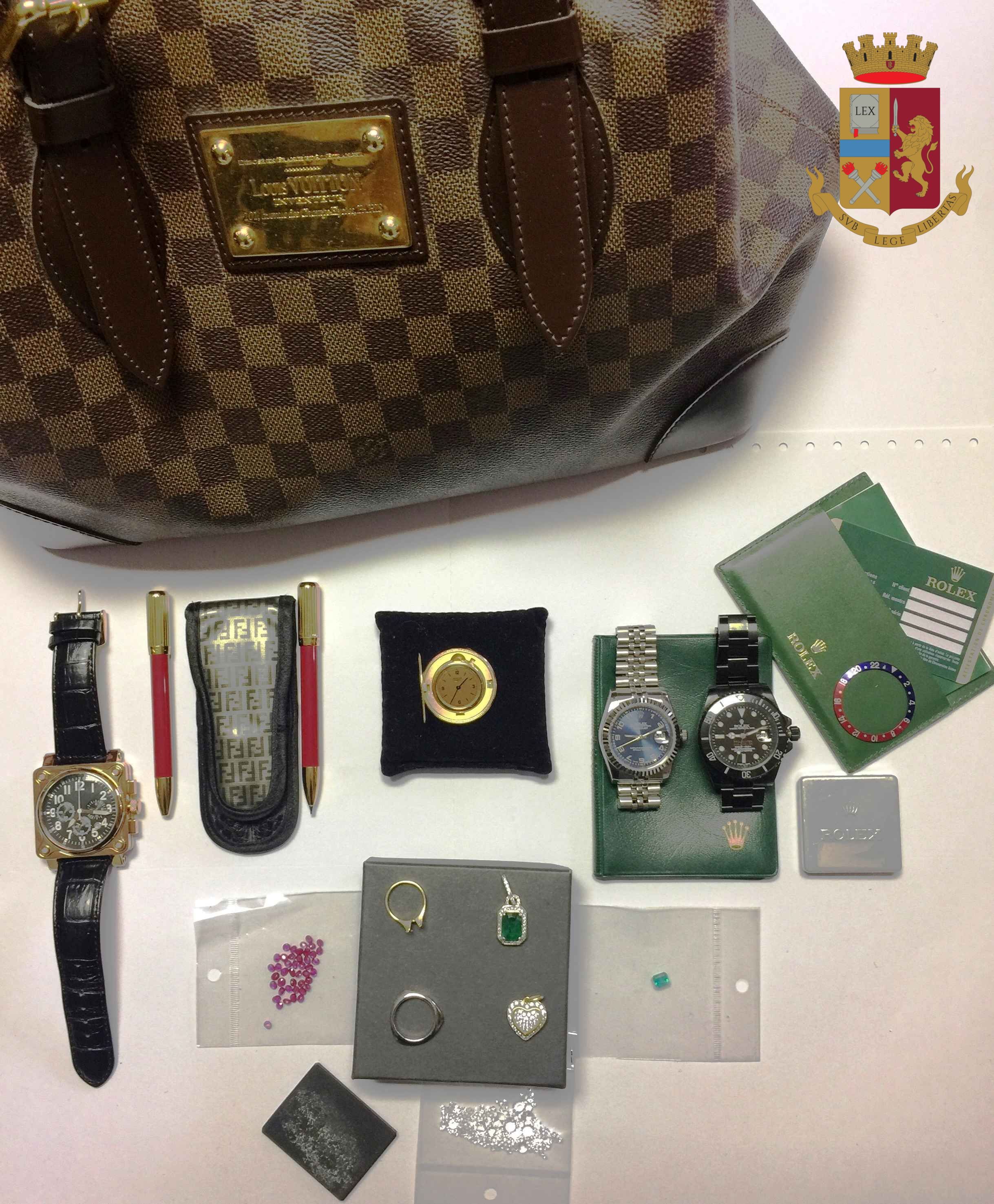 E’ scattato quindi il blitz, e nel corso di una perquisizione domiciliare sono stati rinvenuti 15.000 euro in contanti, celati nel materassino di un passeggino, una moneta d’oro antica, con incastonato, con apertura a scomparsa, un orologio Rolex, altri due orologi della stessa marca, uno smeraldo, 44 rubini, varie pietre preziose e diversi gioielli.