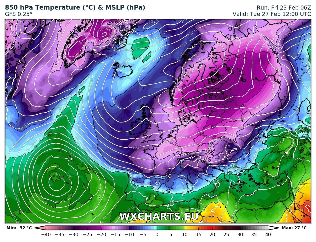 Un lobo del VP (Polar Vortex), più precisamente il lobo Siberiano, si è già messo in cammino verso l’Europa centrale portando con se isoterme a 850 hpa (corrispondenti all’incirca a 1500 metri di quota) davvero gelide, comprese fra la -24 e la -28 e sta battendo svariati record anche quanto ad estensione, vista la vastità della colata gelida che lentamente sta percorrendo l’Europa dell’est.
