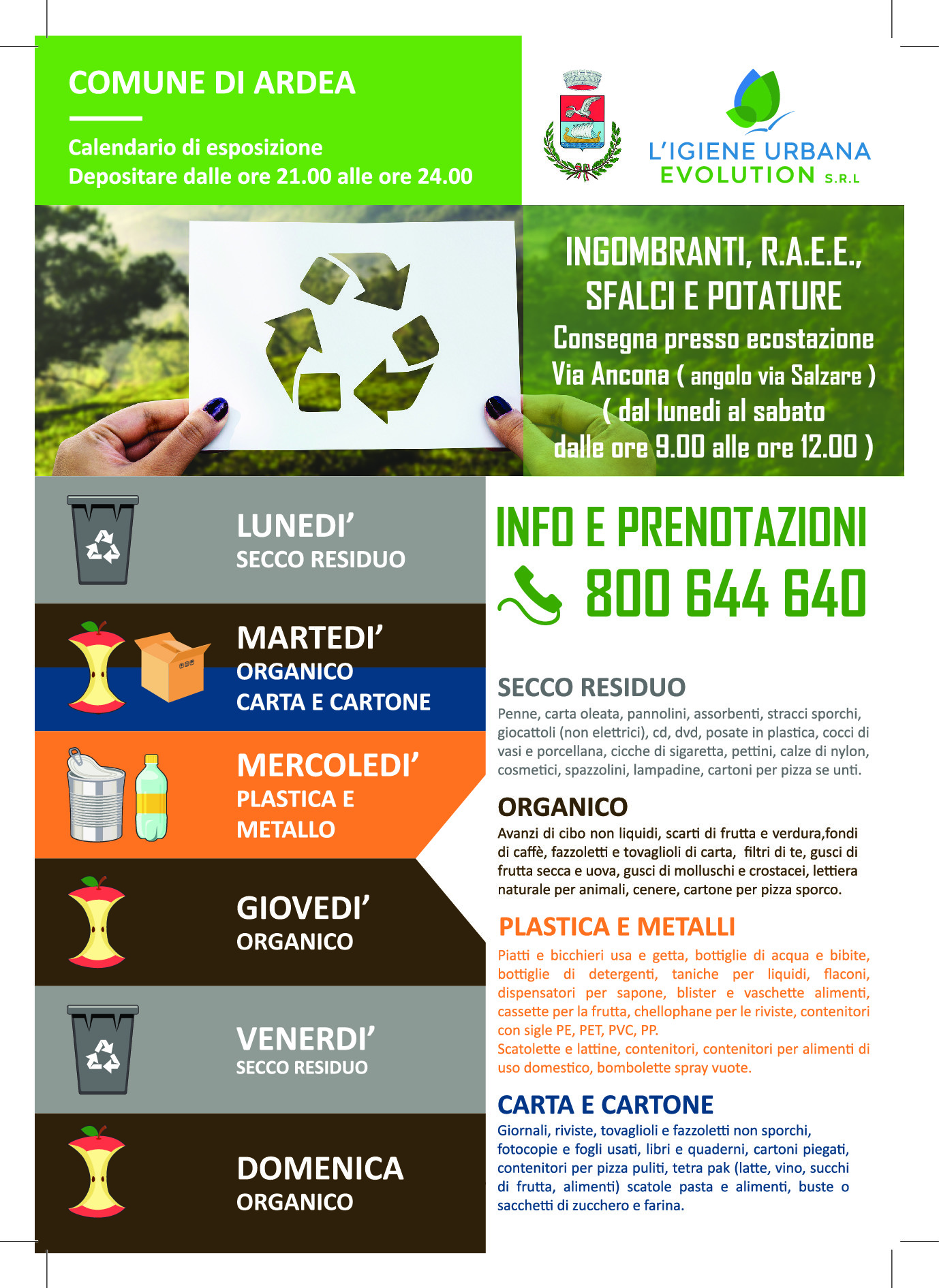 Il Comune di Ardea ha pubblicato, quale promemoria, il calendario estivo per la raccolta e il conferimento dei rifiuti. “E’ fondamentale la collaborazione di tutti soprattutto nel periodo estivo che vede il nostro territorio, ed in particolare il litorale, un aumento delle persone, e di conseguenza dei rifiuti prodotti”, scrive in una note l’Ente. Di seguito la locandina con tutte le informazioni.