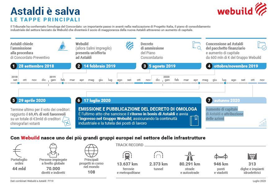“Questa è l’operazione che forse mi rende più orgoglioso nel corso della mia vita, perchè fa bene al Paese dove abbiamo le nostre radici e perchè avviene in un momento particolarmente complesso per tutto il settore, facendoci vedere una luce sul futuro in fondo al tunnel. Una operazione resa possibile da una grande squadra di professionisti che mi ha accompagnato per più di due anni in un lungo percorso. La pubblicazione del decreto di omologa rappresenta la conclusione del progetto di integrazione con Astaldi, una delle imprese italiane più importanti del settore, che ha fatto la storia delle infrastrutture in tutto il mondo”, commenta Pietro Salini, ad del Gruppo Webuild.