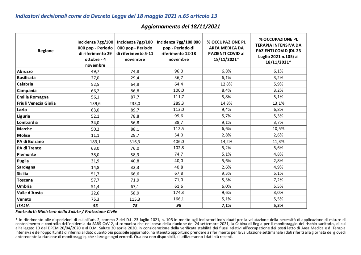 Tra le Regioni a rischio zona gialla ad oggi ci sono, sulla base dei dati qui sopra riportati, la PA di Bolzano, il Friuli Venezia Giulia, e, in misura minore la Calabria. Ricordiamo che per il passaggio di colore da bianco a giallo è necessario che vi sia un’occupazione dell’area medica superiore al 15% e quella della terapia intensiva sopra il 10%. Tale parametro, aggiunto nei mesi scorsi, si affianca a quello dell’incidenza settimanale per 100.000 abitanti: anche laddove si verifichi infatti un’incidenza dei casi Covid superiore a 50 (per 3 settimane consecutive) la Regione resta in fascia bianca a patto di rimanere entro le soglie dei posti letti poc’anzi specificate.