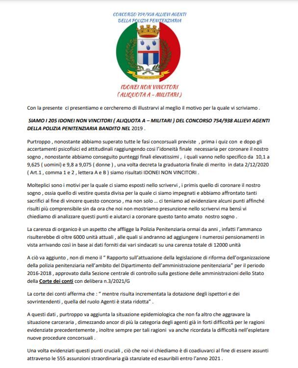 Leggi anche: Concorso Polizia Penitenziaria: la voce dei 205 idonei assumibili a costo zero ma lasciati a casa