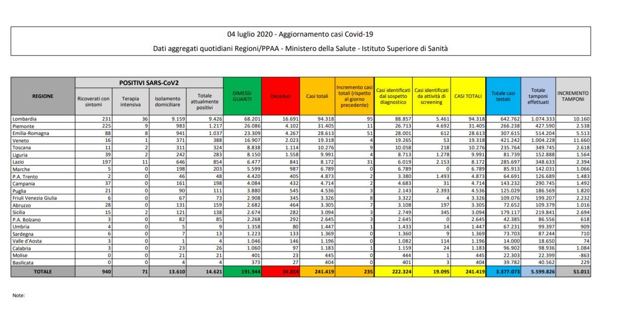 ROMA (ITALPRESS) – Il totale delle persone che hanno contratto il coronavirus è di 241.419, con un incremento rispetto a ieri (3 luglio) di 235 nuovi casi. Lo rende noto il ministero della Salute. Il numero totale di attualmente positivi è di 14.621, con una decrescita di 263 assistiti rispetto al 3 luglio. Tra gli attualmente positivi, 71 sono in cura presso le terapie intensive, con un decremento di 8 pazienti rispetto al 3 luglio. 940 persone sono ricoverate con sintomi, con un decremento di 16 pazienti rispetto al 3 luglio. 13.610 persone sono in isolamento senza sintomi o con sintomi lievi. Rispetto al 3 luglio i nuovi deceduti sono 21 e portano il totale a 34.854. Il numero complessivo dei dimessi e guariti sale invece a 191.944, con un incremento di 477 persone rispetto al 3 luglio. Il numero di tamponi effettuati nelle ultime ventiquattro ore ammonta a 51.011, per un totale di 5.599.826.