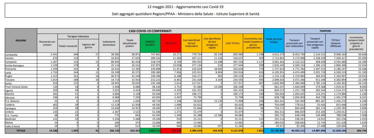Prosegue il trend di riduzione dei ricoveri nei reparti ordinari: sono 14.280 con un calo di 657 pazienti; discesa pure nelle terapie intensive, 1.992 (-64), ma con 91 nuovi ingressi. In isolamento domiciliare vi sono 336.150 persone. La regione con il maggior numero di casi è la Lombardia (1.198), seguita da Campania (1.127) e Piemonte (774).