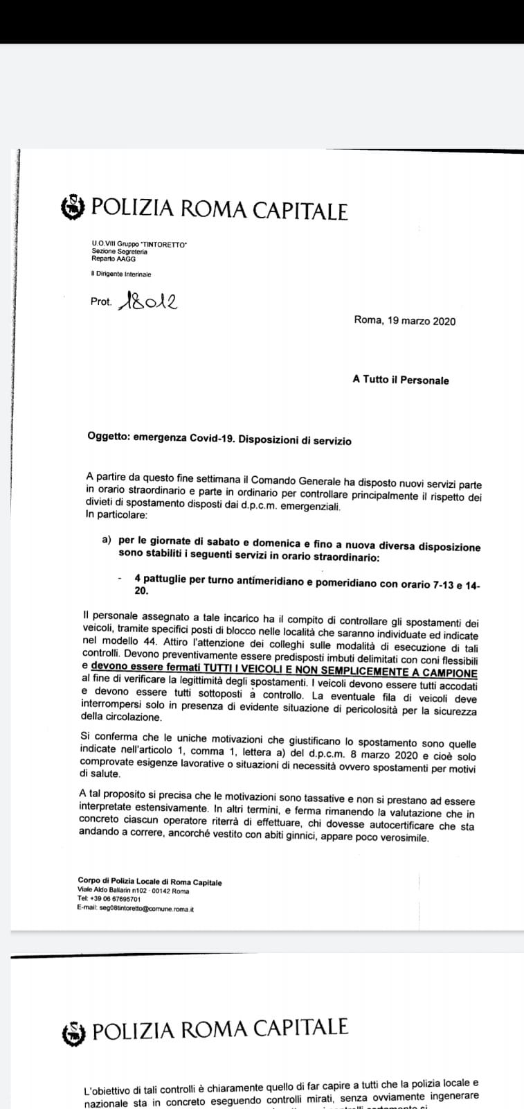 Coronavirus Roma, devono essere fermati tutti i veicoli e non semplicemente a campione – questo è quello che si legge nel testo delle nuove disposizioni di servizio della Polizia Locale.