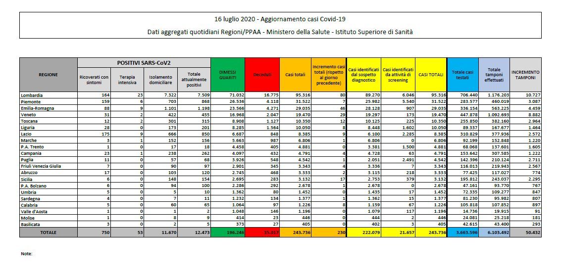 ROMA (ITALPRESS) – Continua l’aumento dei nuovi contagi da coronavirus in Italia. Sono 230 i nuovi casi (ieri erano stati 163). E’ quanto riporta il consueto bollettino del Ministero della Salute. Il numero totale dei positivi, da inizio pandemia, sale perciò a 243.736. In aumento anche i morti, 20 rispetto ai 13 di ieri. I decessi superano quindi la soglia dei 35 mila (per l’esattezza si attestano a 35.017). In lieve calo il numero degli attualmente positivi, adesso sono 12.473, con un decremento nelle ultime 24 ore di 20. In aumento i guariti, 230 in più rispetto a ieri, dato che porta il totale a 196.246. In flessione il numero dei ricoverati, 47 in meno rispetto a ieri: oggi sono 750. Di questi 53 si trovano ricoverati nei reparti di terapia intensiva, 4 in meno rispetto a ieri. Infine, per quanto riguarda il numero di coloro che si trovano in isolamento, in tutto sono 11.670, con un aumento di 31 unità.