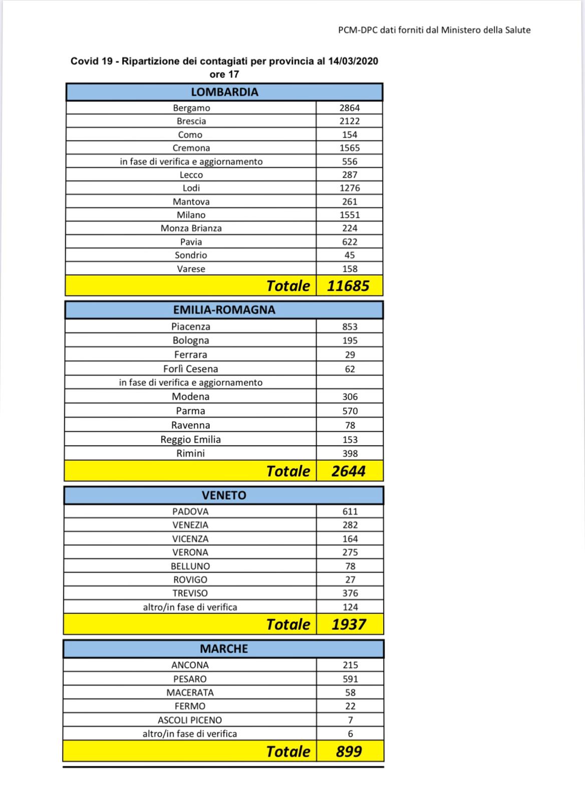 Punto sulla situazione aggiornato alle ore 17.00 di oggi, sabato 14 marzo 2020, sull’emergenza Coronavirus. Sono stati diffusi gli ultimi dati sul contagio in Italia: attualmente i casi sono 17.750, a cui vanno sommati, purtroppo, le 1.441 persone decedute e quelle guarite (1.966). In tutto sono 21.157 i casi complessivi di Covid-19 nel nostro paese.