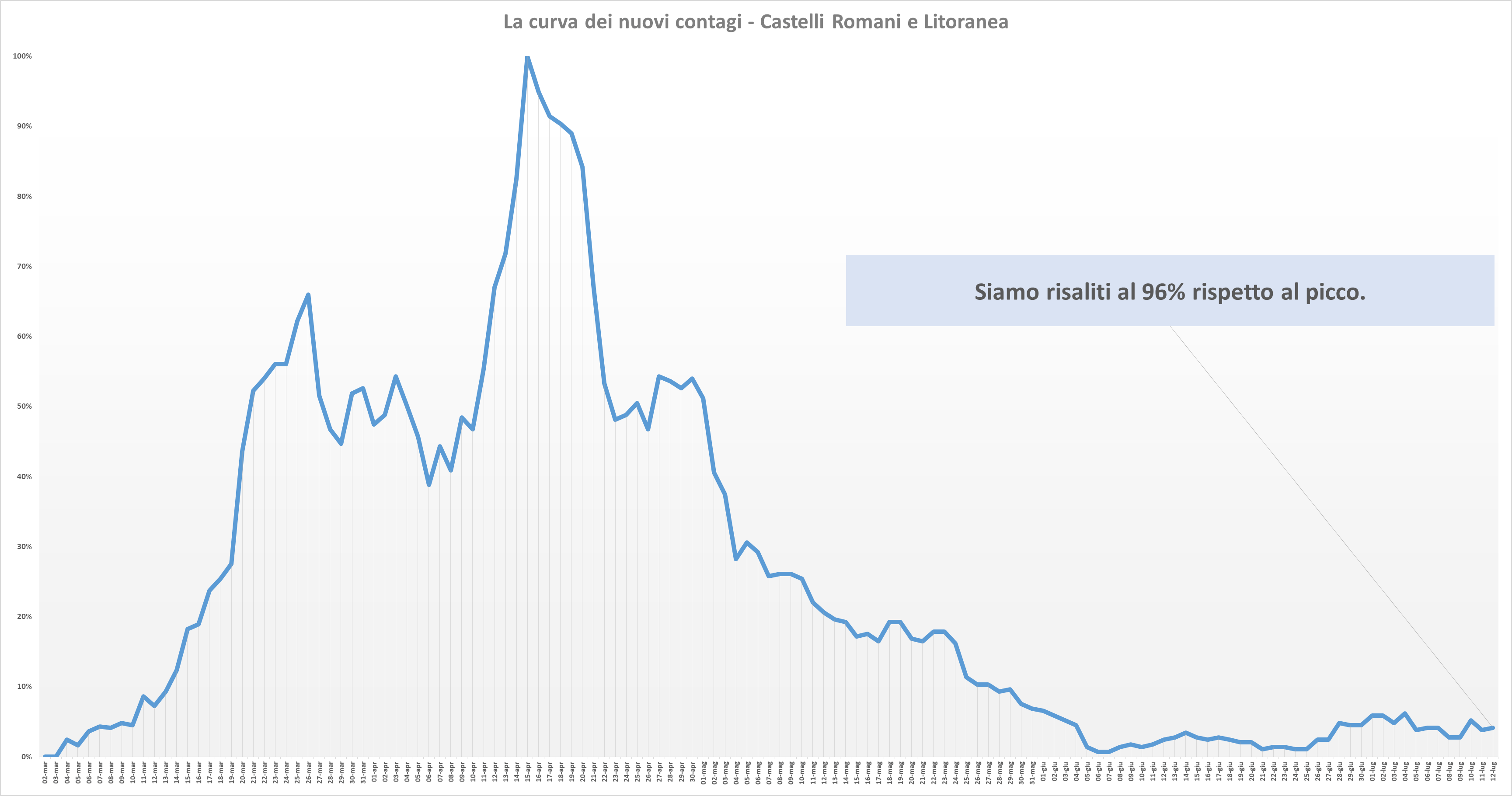 Rispetto al picco la curva dei nuovi contagi è pericolosamente risalita al 96%.