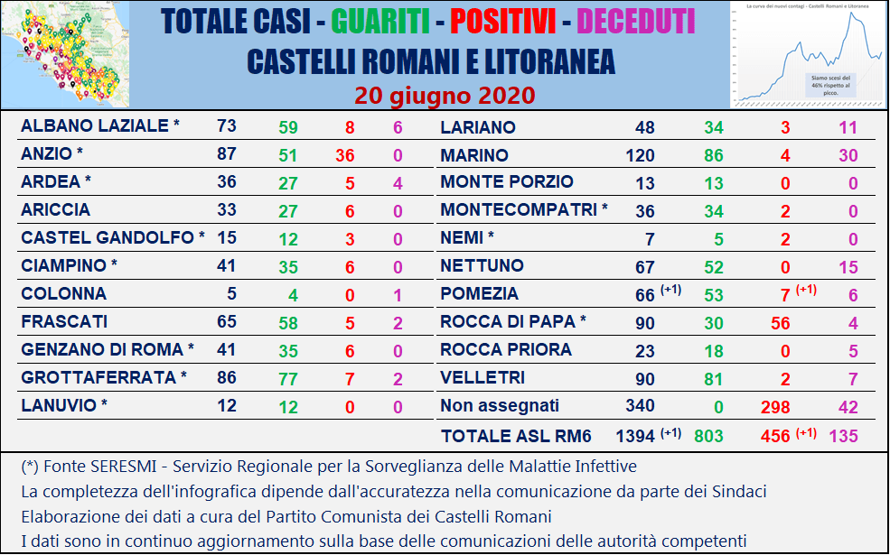 Nella ASL RM6, che comprende i Castelli Romani e la Litoranea, il 20 giugno si è verificato un nuovo caso. Il numero complessivo dei guariti è stabile a 803, mentre il numero delle persone attualmente positive è salito a 456 (+1) e il numero dei decessi è rimasto stabile a 135 casi.