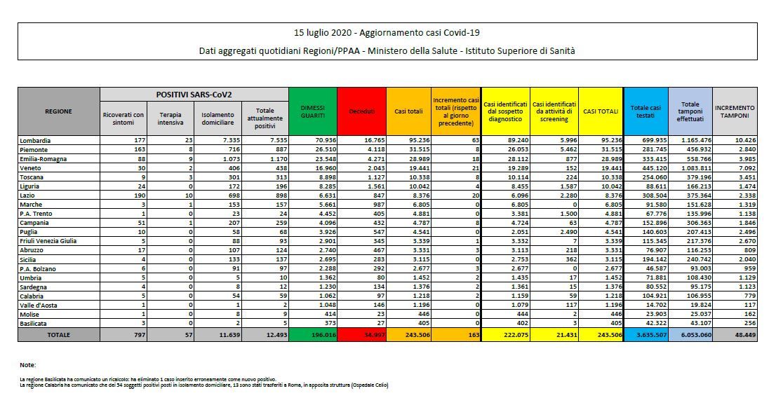 ROMA (ITALPRESS) – Risale in Italia il numero dei nuovi casi di coronavirus. Secondo i dati contenuti nel bollettino del Ministero della Salute, sono 163 i nuovi contagiati (ieri erano 114). Il numero totale, da inizio pandemia, sale quindi a 243.506. In leggero calo i decessi: nelle ultime 24 ore sono stati 13, contro i 17 di ieri, portando il numero complessivo a un soffio dalla soglia dei 35 mila. In crescita i guariti, 575 rispetto a ieri: il totale conta 196.016. Per quanto riguarda gli attualmente positivi sono 12.493, con una riduzione nelle ultime 24 ore di 426. In aumento di 20 i ricoverati: oggi sono 797, 57 dei quali si trovano in terapia intensiva (3 in meno rispetto a ieri). Infine in calo coloro che si trovano in isolamento: in tutto sono 11.639, -443 rispetto a ieri.