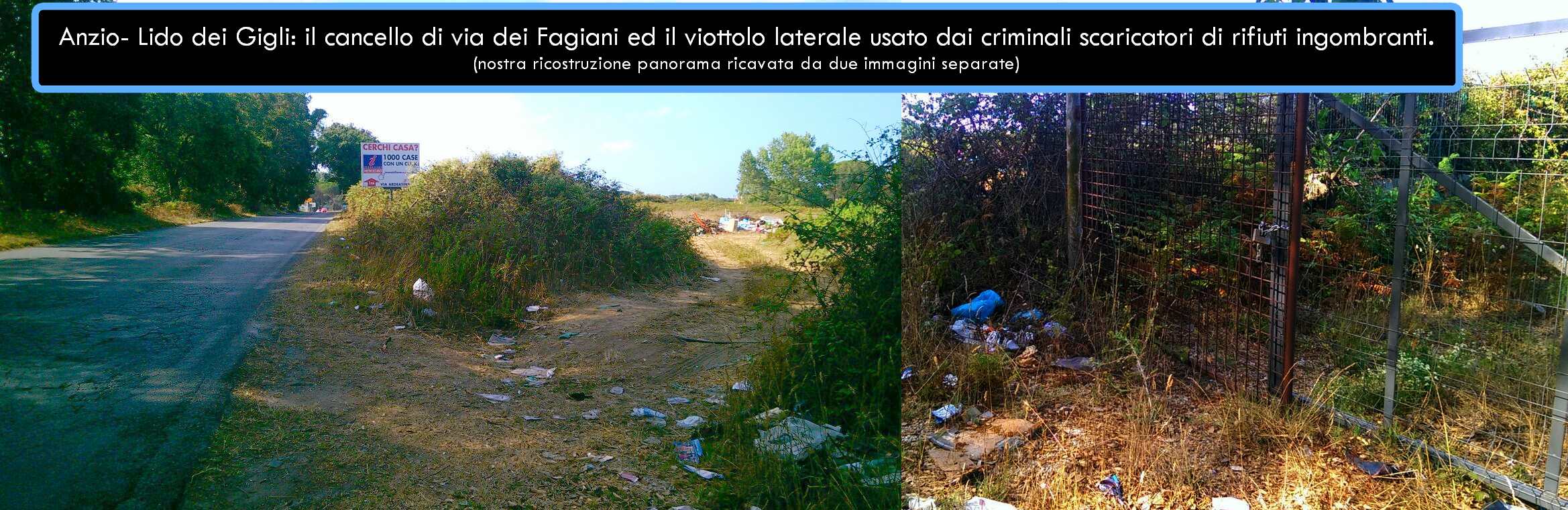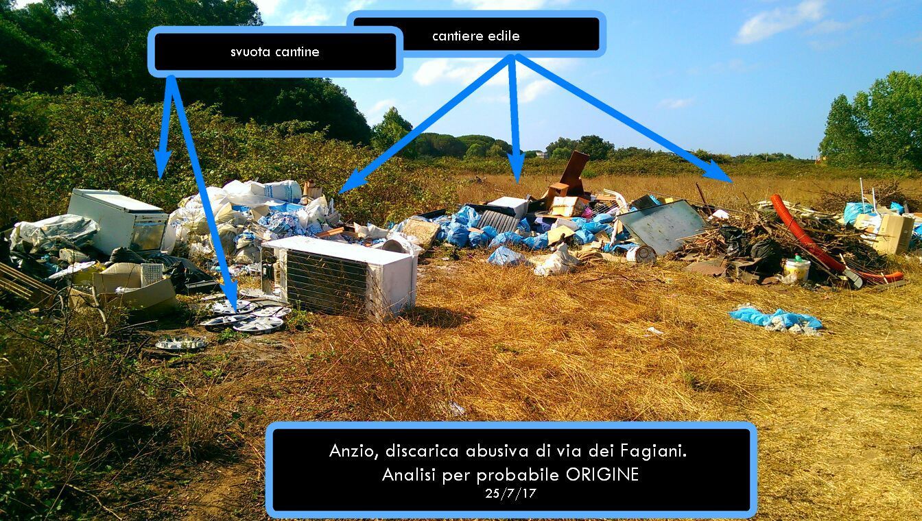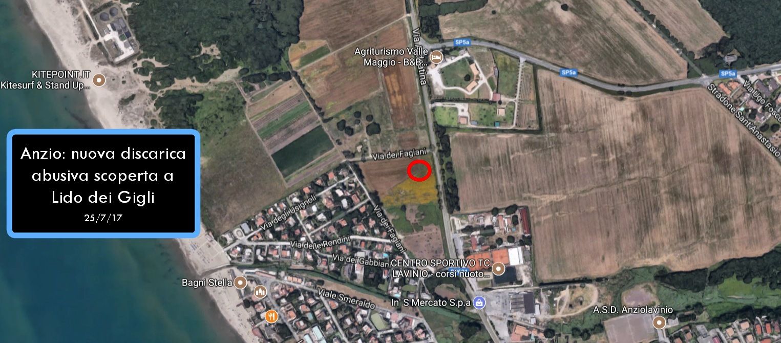 “Segnaliamo il ritrovamento di una consistente discarica abusiva di rifiuti vari (prevalentemente ingombranti e inerti) ritrovata a poche decine di metri dalla via Ardeatina, al termine di un viottolo che parte di lato al cancello che chiude via dei Fagiani, strada del consorzio residenziale di Lido dei Gigli. Il punto è circa al km. 31,7 della via Ardeatina”.