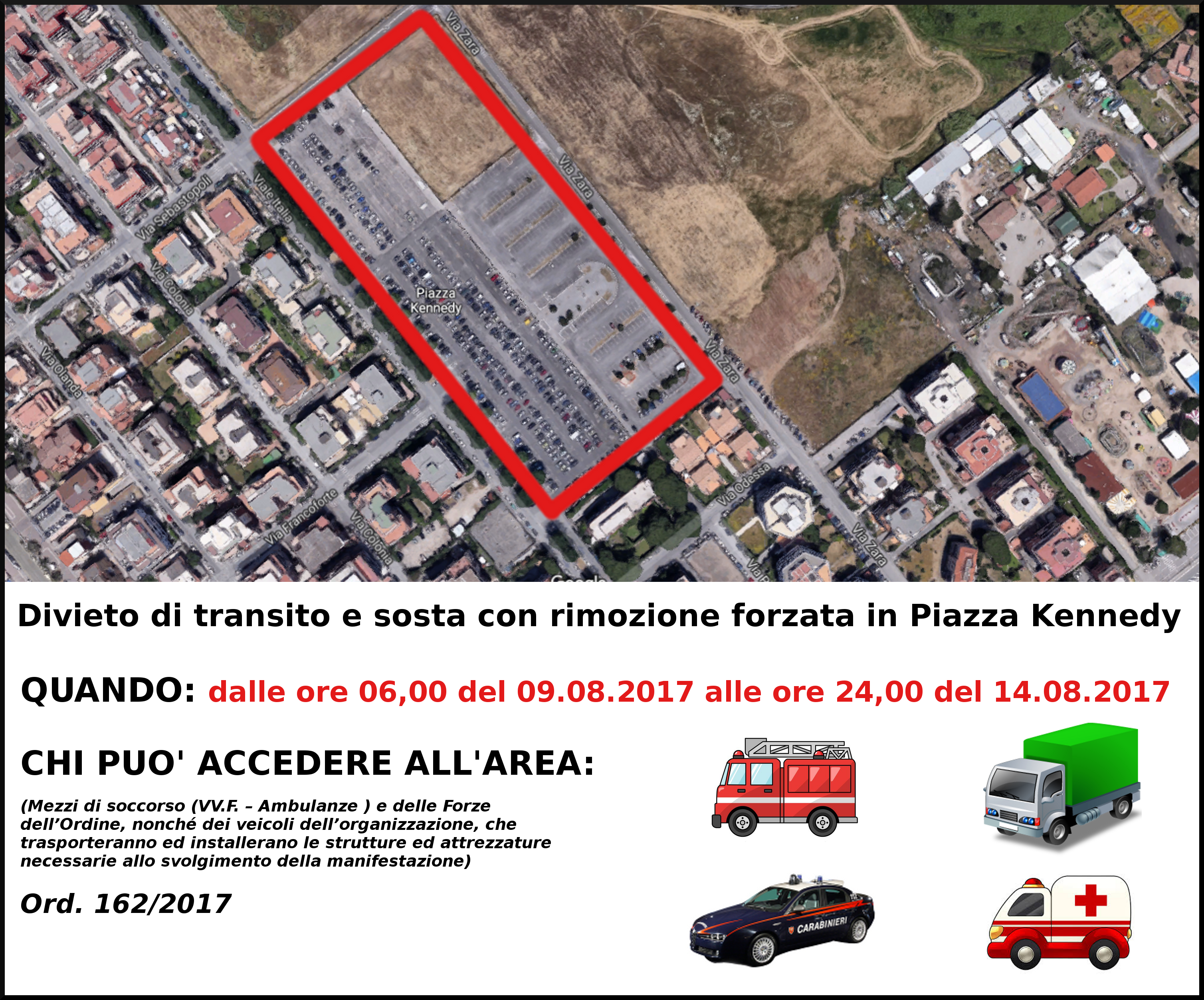 Nell’atto si legge dunque che verrà istituito un “Divieto temporaneo di transito e sosta, con rimozione forzata, in Piazzale Kennedy, in località Torvajanica, dalle ore 06,00 del 09.08.2017 alle ore 24,00 del 14.08.2017, onde consentire il montaggio e lo smontaggio delle attrezzature necessarie per la Manifestazione “Circo Nero”, nonché lo svolgimento della manifestazione stessa con esclusione dei mezzi di soccorso (VV.F. – Ambulanze ) e delle Forze dell’Ordine, nonché dei veicoli dell’organizzazione, che trasporteranno ed installerano le strutture ed attrezzature necessarie allo svolgimento della manifestazione”.