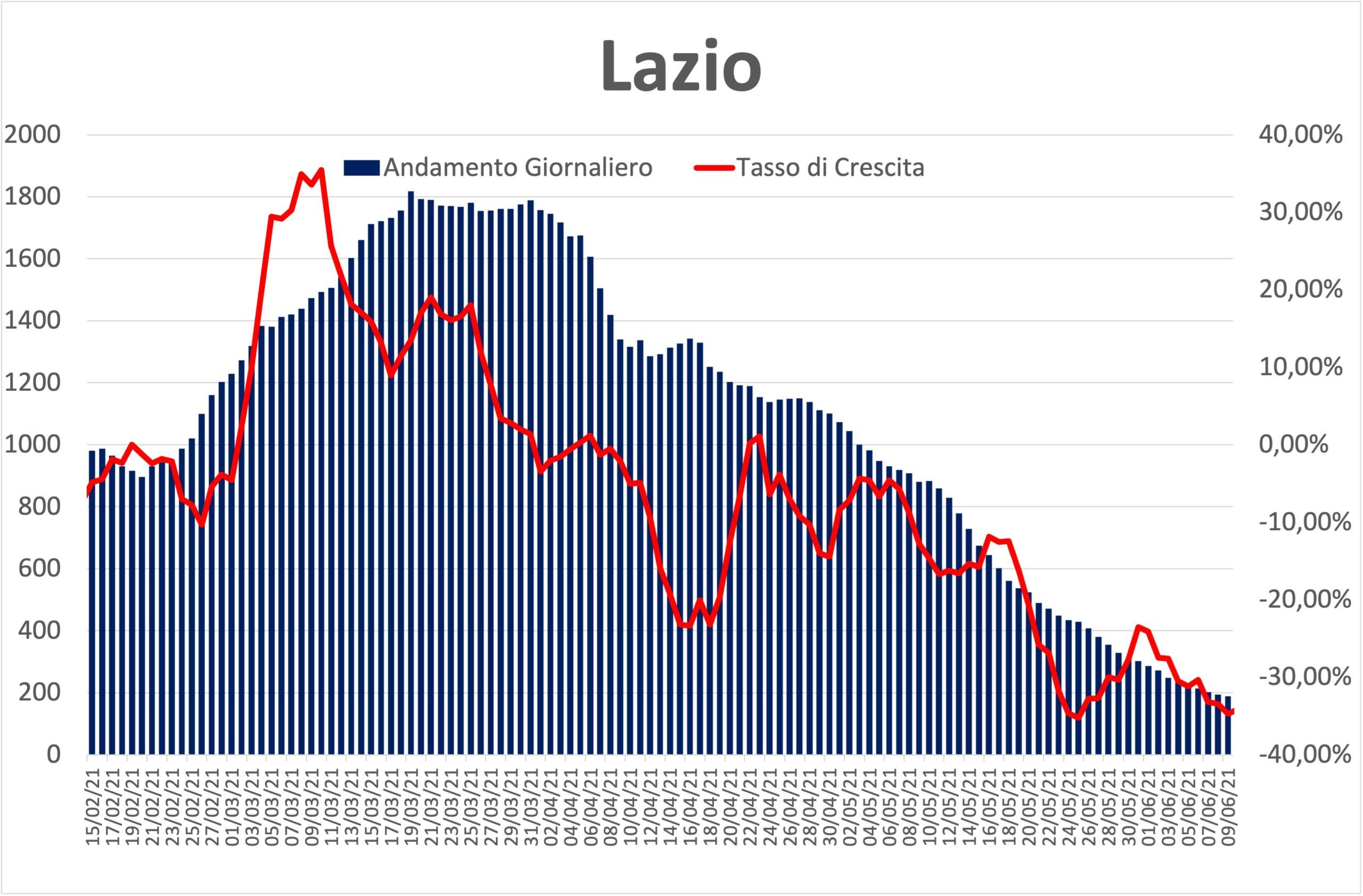 Il tasso di crescita percentuale continua a essere in calo in tutte le Province eccezion fatta per Viterbo passata dal -50% del precedente aggiornamento al +5% di questa settimana (da capire se questo piccolo “balzo” sarà riassorbito in fretta o meno).