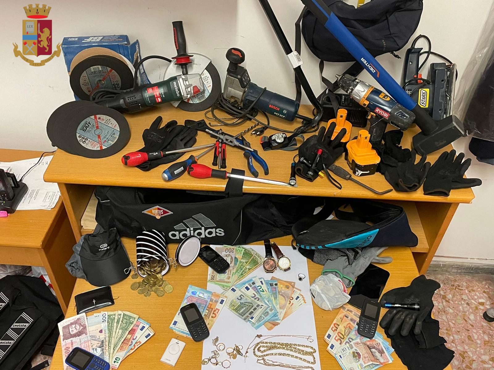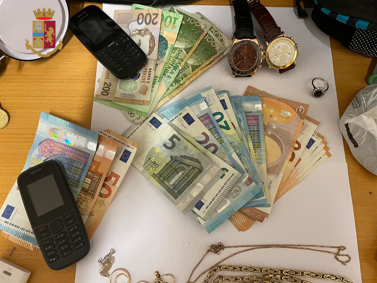 K.E. 35 anni, N.N 23 anni e G.F. di 33 anni sono stati fermati durante il loro furto presso l’abitazioni in via Santa Maria della Grotticella. I tre sono stati sottoposti a controllo e la loro abitazione a perquisizione. Inseguito al controllo, effettuato al momento del loro arresto, sono stati ritrovati gli oggetti appena sequestrati nell’abitazione come 500 euro in contanti, salvadanaio, vari oggetti in oro e infine telefoni e altro denaro che avevano con loro. Nella perquisizione presso il loro bungalow sono stati trovate banconote albanesi pari a 8.200 lek e banconote italiane per un valore complessivo di 523 euro, un anello probabilmente di oro bianco con diamantini e una pietra nera al centro, un cellulare e due orologi. I tre ladri sono stati associati in carcere a Poggioreale.