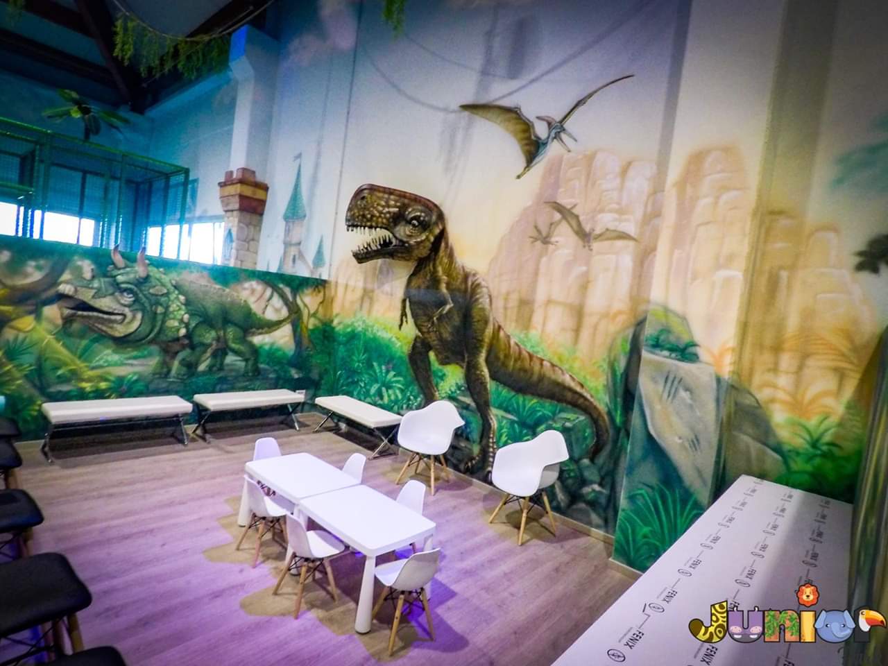Lo Junior Park offre quattro diverse sale private a tema (Dinosauri, Oceania, Castello, Giungla) da scegliere, tutte con sedute in pelle, bancone per gli adulti con vista playground, tavolini ad altezza bambino per la torta e tavolo per buffet. Il locale è completamente climatizzato e si trova al primo piano del centro commerciale Sedici Pini.