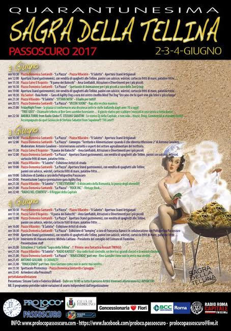 “Anche quest’anno torna a Passoscuro l’appuntamento tanto atteso con la Sagra della Tellina, organizzata dalla Pro Loco con il Patrocinio del Comune di Fiumicino. La quarantunesima edizione della sagra, un evento che si conferma di grande richiamo per il nostro territorio e un’occasione per valorizzare i nostri prodotti ittici, si terrà dal prossimo venerdì 2 giugno a domenica 4 giugno.