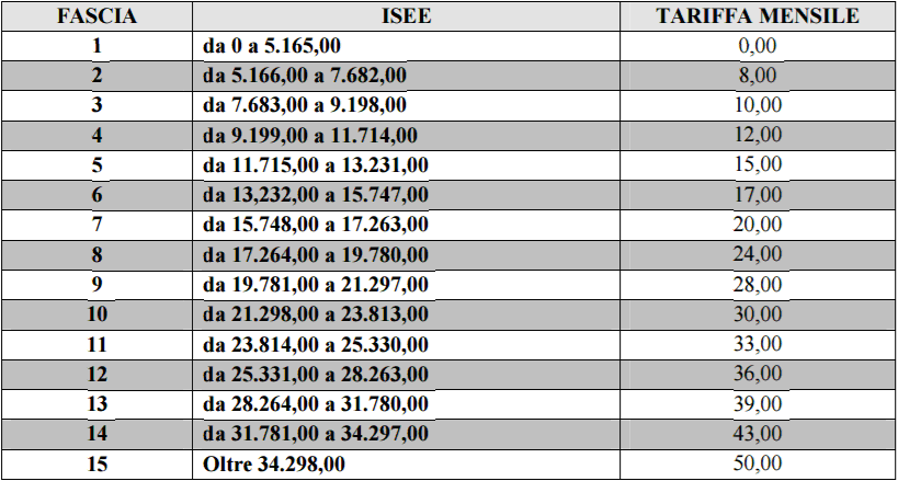 Ogni utente del Servizio dovrà versare, entro il 01/10/2017, la retta annuale, oppure pagare in rate mensili anticipate, da corrispondere entro i primi cinque giorni del mese a decorrere da quello di settembre, stabilite in base al valore ISEE del nucleo familiare, applicando queste 15 diverse tariffe approvate dalla Giunta Comunale con la deliberazione n. 13 del 09/02/2017.
