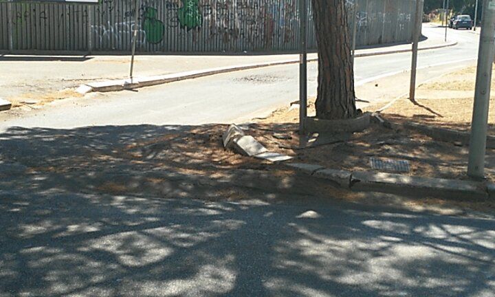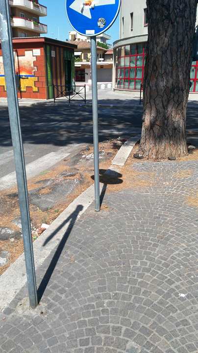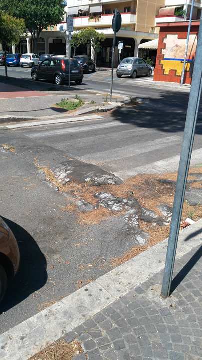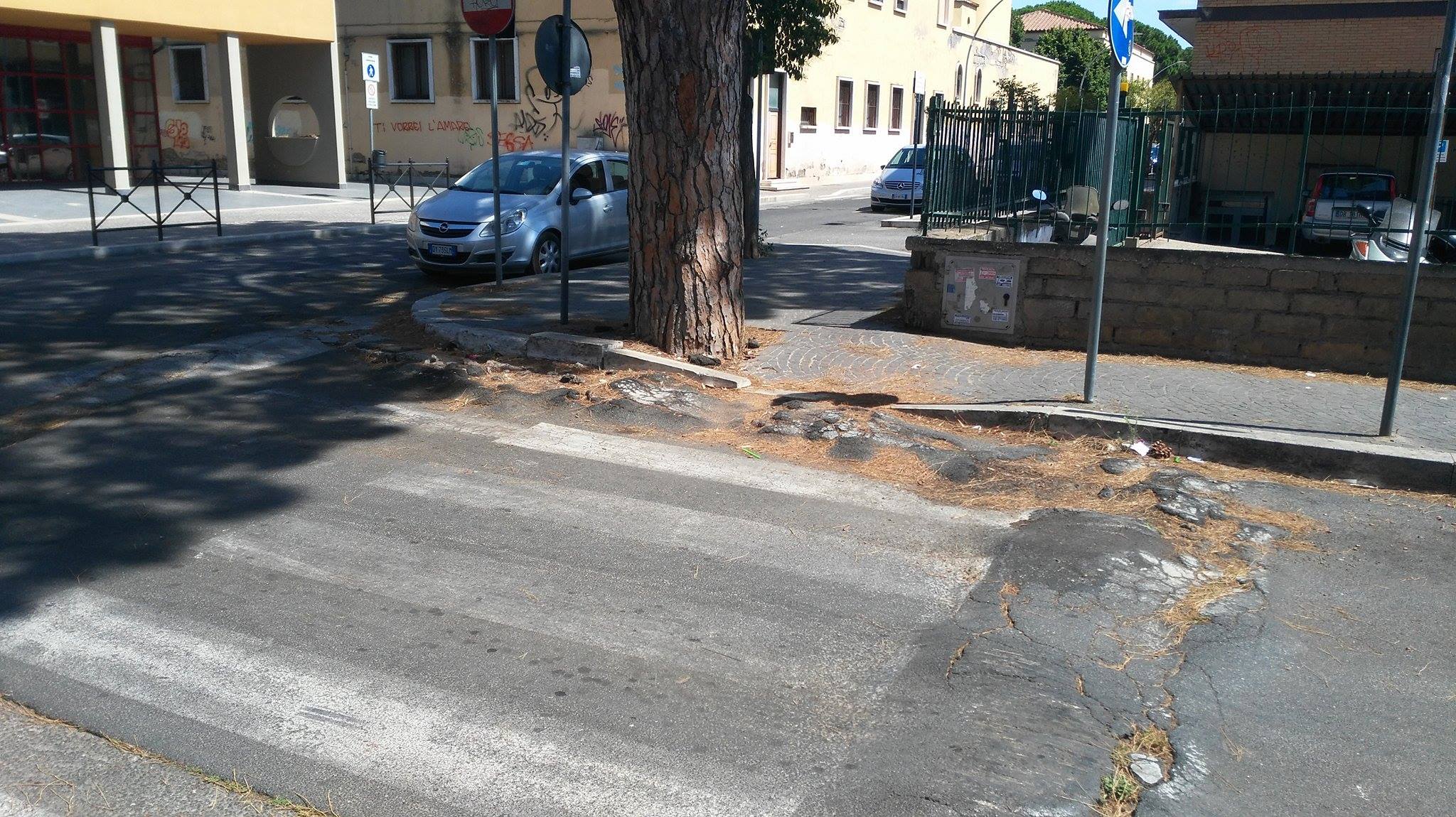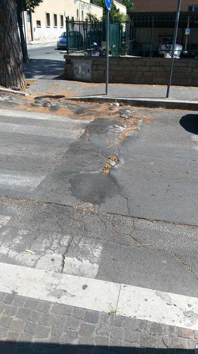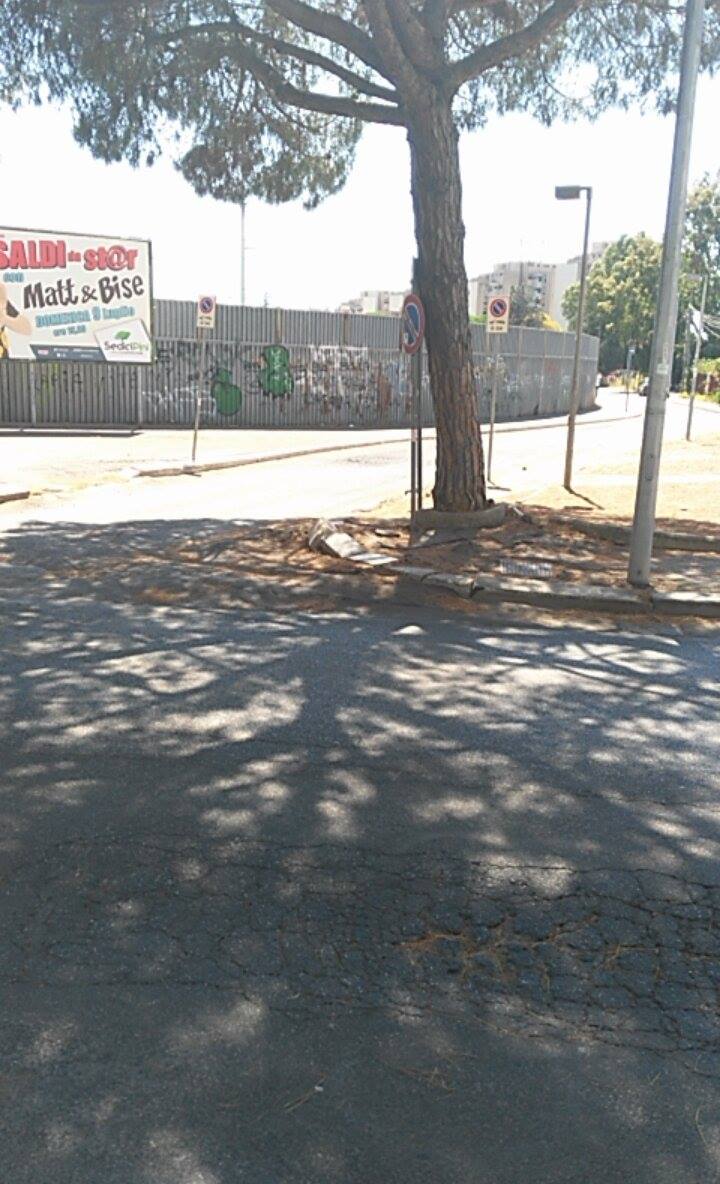 “La prima strada – prosegue la segnalazione è dietro la biblioteca: il manto stradale è rialzato dalle radici dell’albero di pino adiacente (si tratta di via Filippo Re, angolo via Varrone, ndr). L’ altra è vicino il liceo Pablo Picasso (via Cavour, ndr): anche lì il manto stradale è dissestato dalle radici delle piante”.