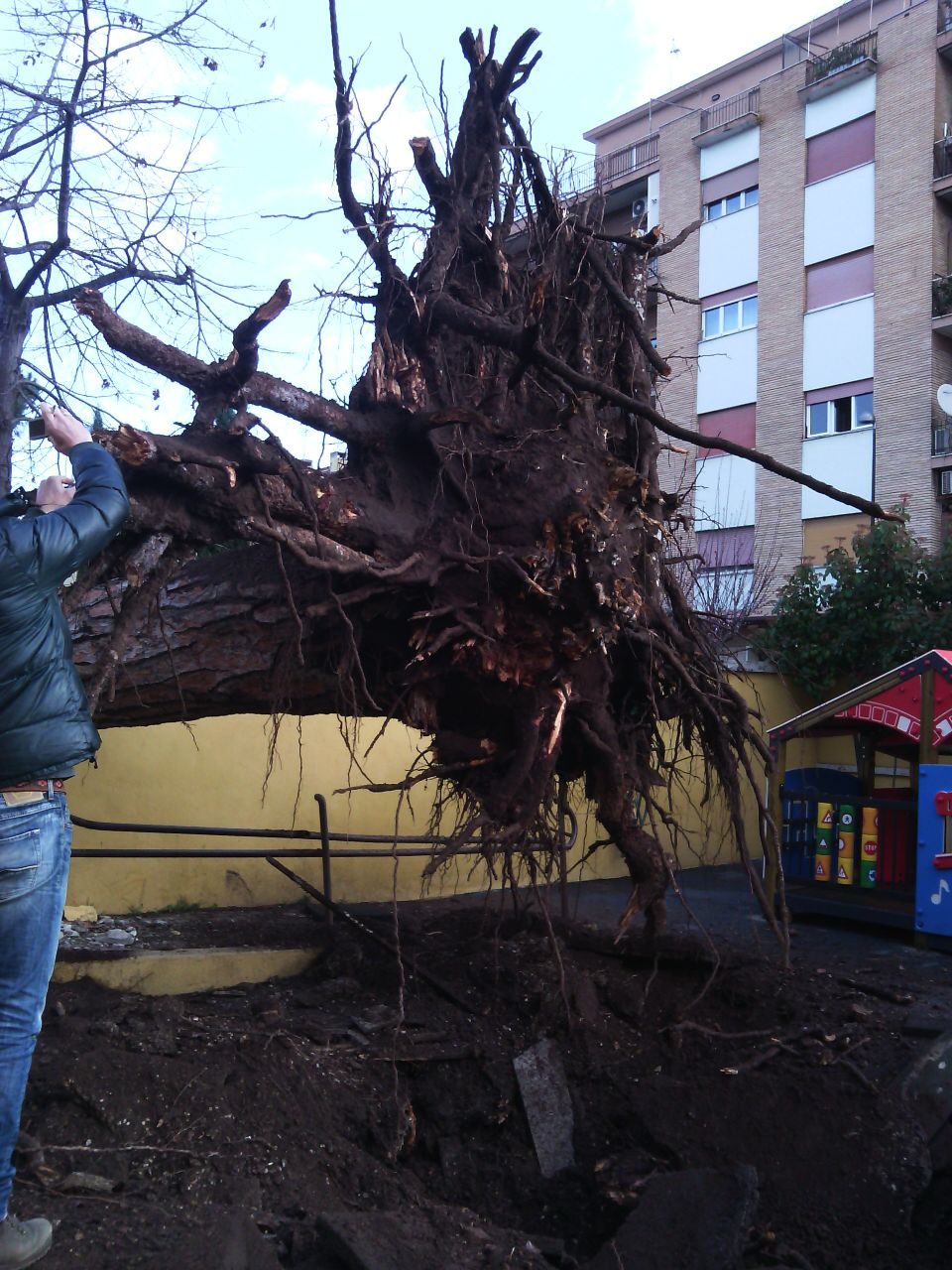 Tragedia sfiorata alla scuola dell’infanzia Maria Immacolata, dove ieri sera intorno alle ore 19:00 un pino secolare è caduto dopo essere stato sradicato a causa del forte vento. Ad accorgersene il proprietario di un hotel vicino, che ha chiamato i vigili del fuoco. L’albero, di grandi dimensioni, si è schiantato nel giardino dell’asilo, distruggendo il muro che separa la scuola materna dall’elementare Don Bosco. I bambini – seppur tra le polemiche sollevate da alcuni genitori – sono regolarmente entrati nelle due scuole. Già da qualche anno sono state fatte richieste per l’abbattimento dei pini che si trovano a ridosso della scuola per la loro pericolosità, anche dovuta alla caduta delle pigne proprio dove giocano bambini, ma finora non sono stati presi provvedimenti. Questo è il secondo albero che viene sradicato dal vento. Questa mattina sul posto ha fatto un sopralluogo anche il sindaco di Pomezia Fabio Fucci. Il pino è stato tolto dal giardino questa mattina.