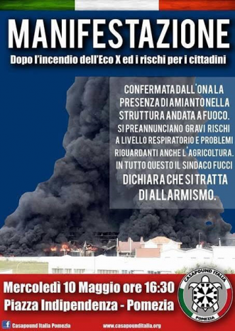 Casapound in Piazza Indipendenza a Pomezia per chiedere le dimissioni del Sindaco Fucci reo, secondo il movimento, di non aver saputo gestire l’emergenza Eco-X. I militanti, che stanno sfilando sotto la sede del Comune, hanno citato il caso Castagnetta-Cinque Poderi – e dell’ormai famoso esposto del novembre scorso che evidenziava lo stato d’incuranza dello stabilimento – e ribadito la preoccupazione per gli impianti similari presenti sul territorio. “Noi vogliamo dimissioni”, è stato lo slogan rivolto quindi a Fabio Fucci.