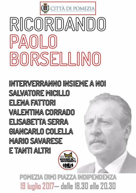 In occasione del 25° anniversario della strage di via D’Amelio, il Comune di Pomezia ha deciso di patrocinare l’iniziativa del gruppo Giovani in Movimento CR “Ricordando Paolo Borsellino”. L’appuntamento è fissato per oggi, mercoledì 19 luglio alle 18.30, in piazza Indipendenza. Lo scopo, lungi dal voler screditare la memoria di un eroe italiano, sarebbe più che nobile senonché, come purtroppo sempre più spesso accade, la lunga mano della speculazione politica ci ha messo nuovamente lo zampino
