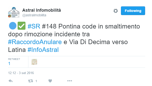 Home » News » Cronaca » Pontina, via di Decima: risolto incidente, code in smaltimento Cronaca Pontina, via di Decima: risolto incidente, code in smaltimento Pubblicato il 3 Settembre 2016 - 11:35 di Redazione Astral SpA comunica che l’incidente che questa mattina ha interessato il tratto della SR148 Pontina tra lo svincolo del raccordo anulare e Via di Decima in direzione Latina è stato rimosso. Il traffico sta pertanto tornando alla normalità. (foto d’archivio)
