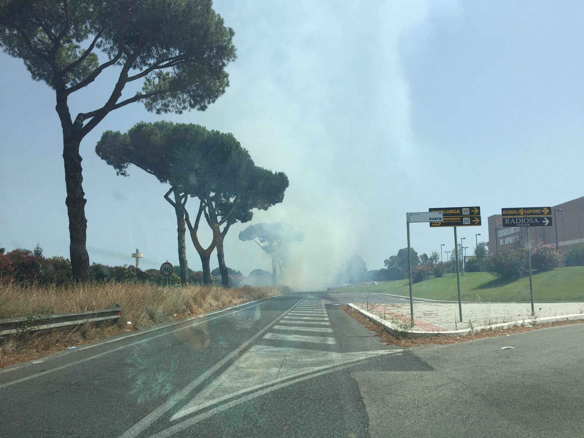 Mentre i vigili del fuoco erano impegnati a spegnere l’incendio divampato all’altezza del chilometro 37+700, altre fiamme lambivano la Pontina, stavolta nei pressi del supermercato Esselunga, ad Aprilia, al chilometro 47.
