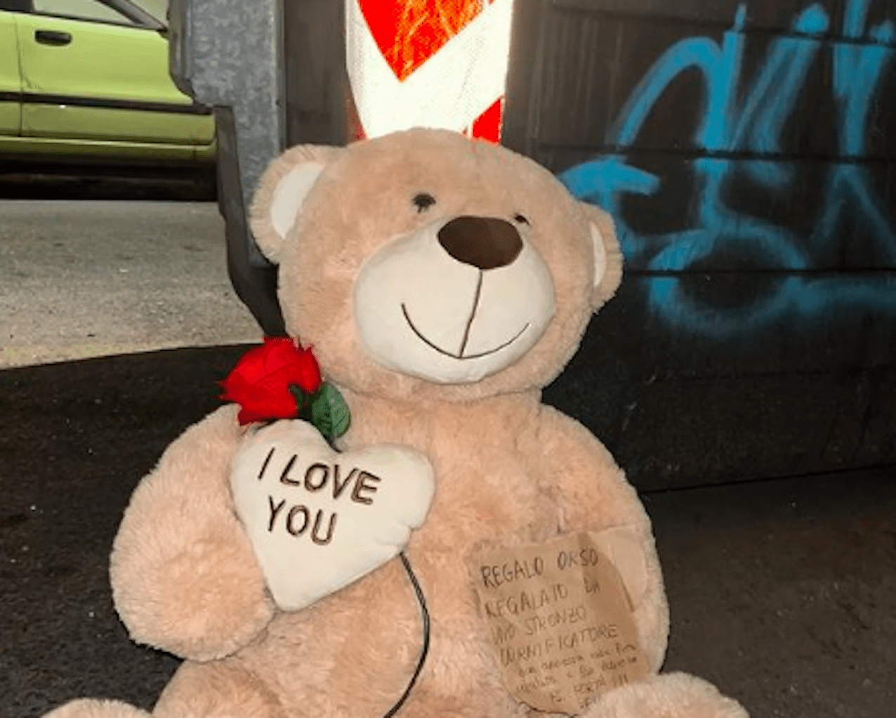 Insomma, una cosa è chiara: si tratta di una storia d’amore finita davvero male. Finita nella spazzatura, proprio come quell’orso di peluche. Il suo sguardo è sconsolato, triste, davanti al cassonetto dell’immondizia a Re di Roma. Un monito per tutti a sole due settimane da San Valentino. Un altro dettaglio, anzi due: l’orso stringe tra le sue zampe un cuoricino con la scritta ”I Love You”, certamente parole al vento, stando alla sua triste fine. E poi, un fiore, una rosa, finta, così come finto era l’amore di cui si era fatto portavoce.