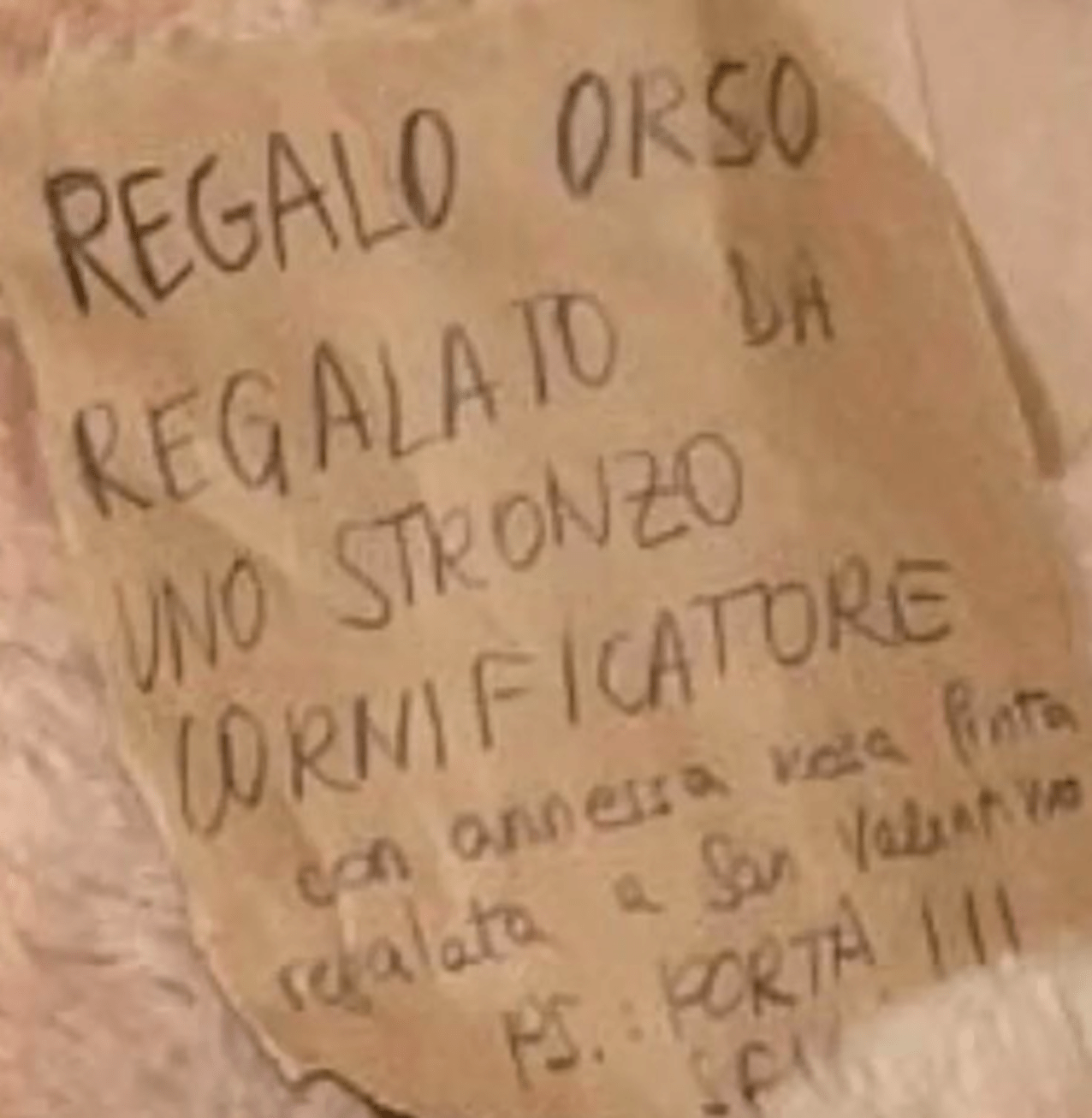 Roma. ”Regalo orso regalato da uno str…. cornificatore con annessa rosa finta regalata a San Valentino. P. S. Porta sfiga!!!”, certo non si tratta di una estatica visione, né di un messaggio che si trova tutti i giorni per strada, con tanto di orsacchiotto e fiore, al fianco di un cassonetto dell’immondizia. In molti si saranno fermati ad osservarlo, soprattutto a leggere quel bigliettino di cartone con le parole suddette. Ma certamente, nessuno si è sognato di portarselo a casa, quel regalo, dal momento che il monito, ricordiamo, recitava: ”Porta Sfiga!!!”.